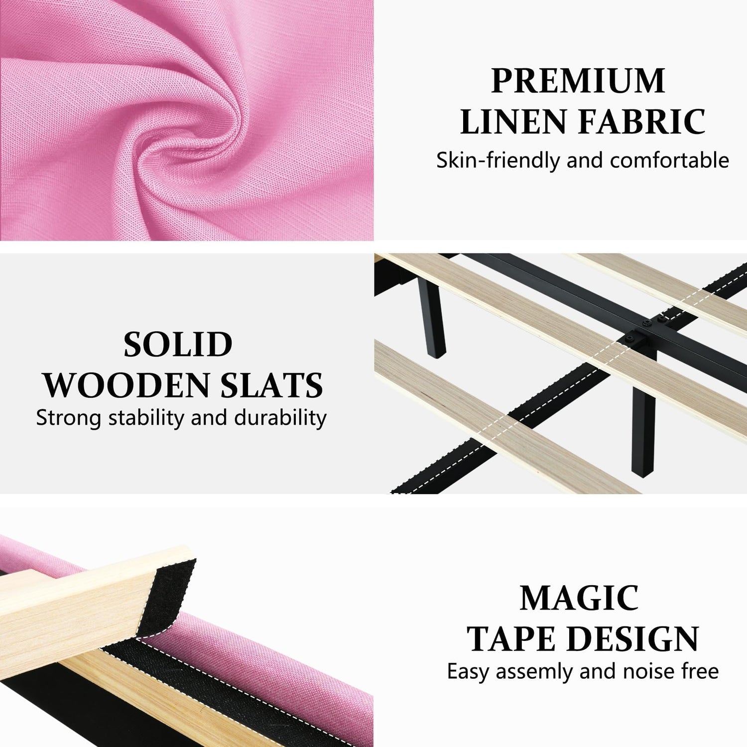 Twin Bed Frames with Button Tufted Headboard, Linen Upholstered Platform Bed with Wooden Slats Support, Princess Bed Frame for Girls, Easy Assembly, No Box Spring Required, Pink