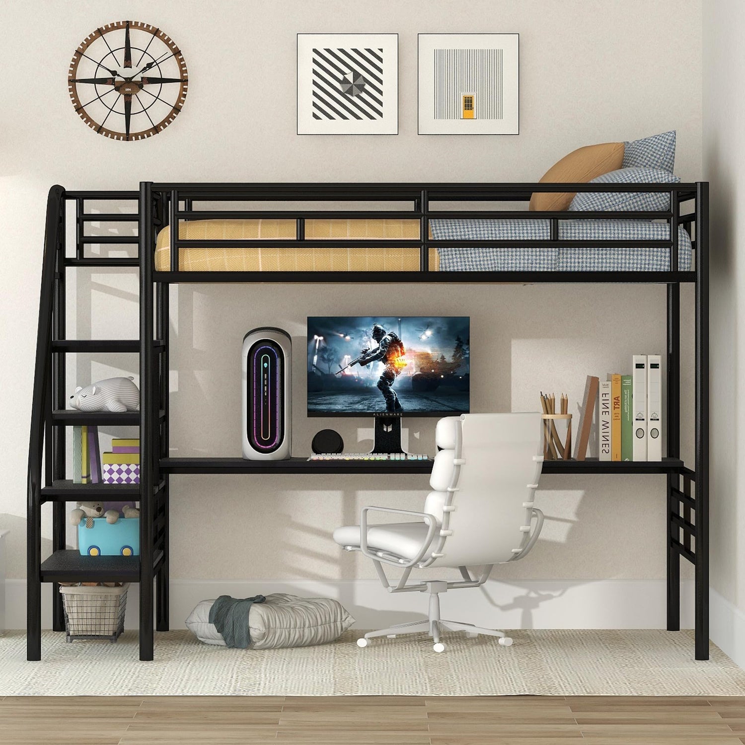 Twin Loft Bed with Desk and Storage Stairs, Heavy Duty Metal Loft Bed with Stairs and Full-Length Guardrail, Twin Loft Bed with Slats No Box Spring Needed(Twin Loft Bed Black)