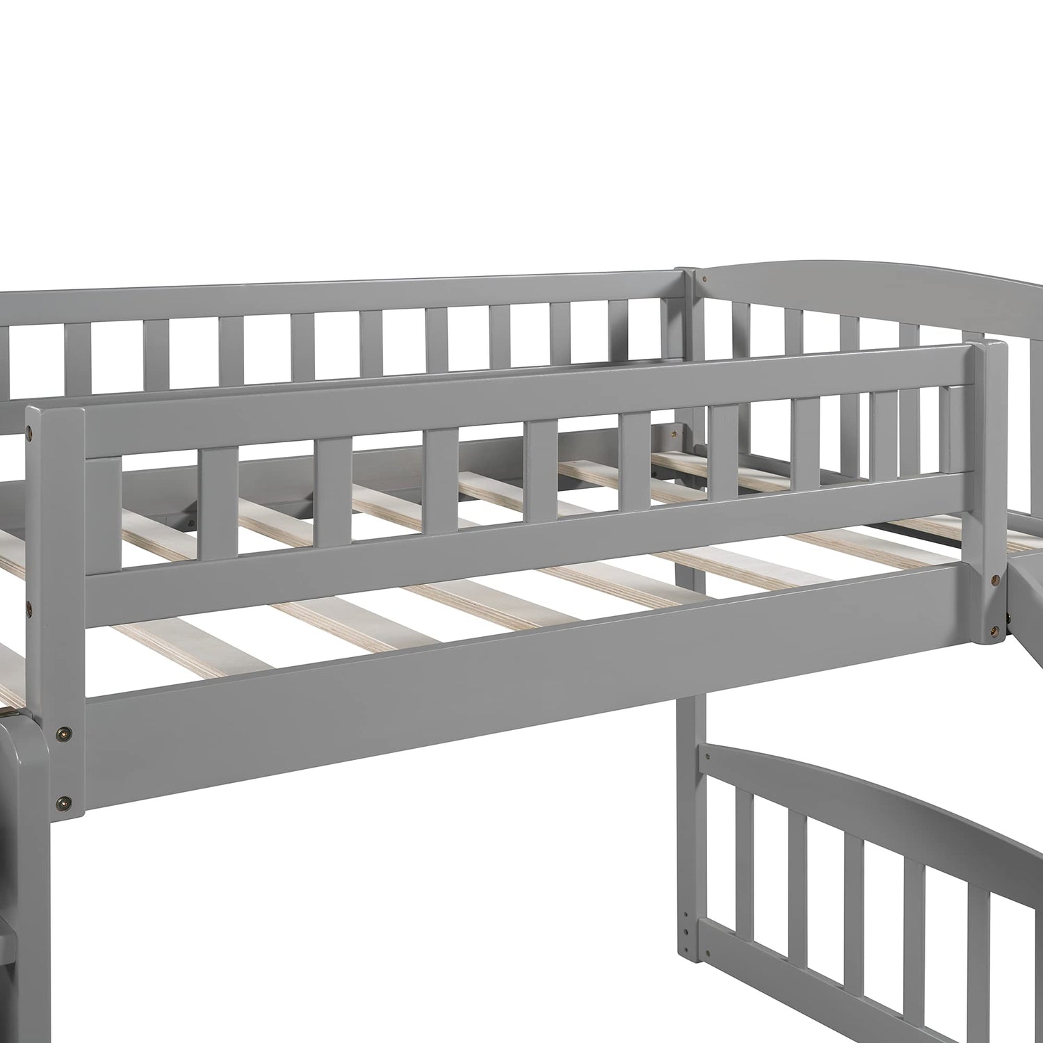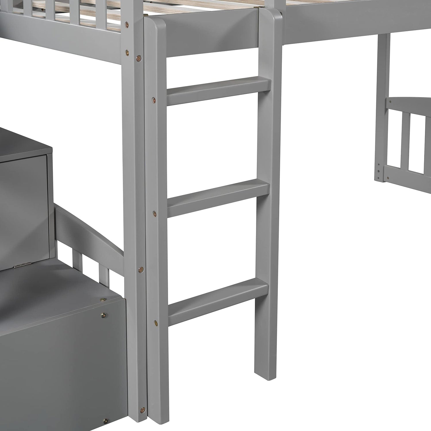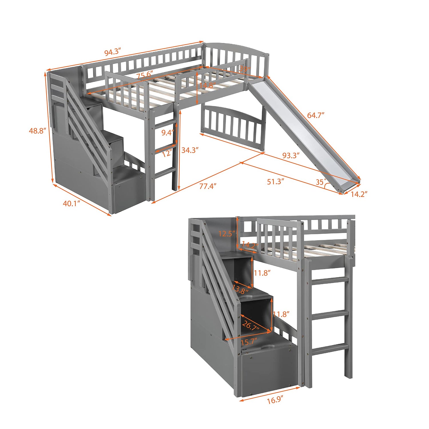 Twin Loft Bed with Slide and Storage Stairs for Kids - Grey