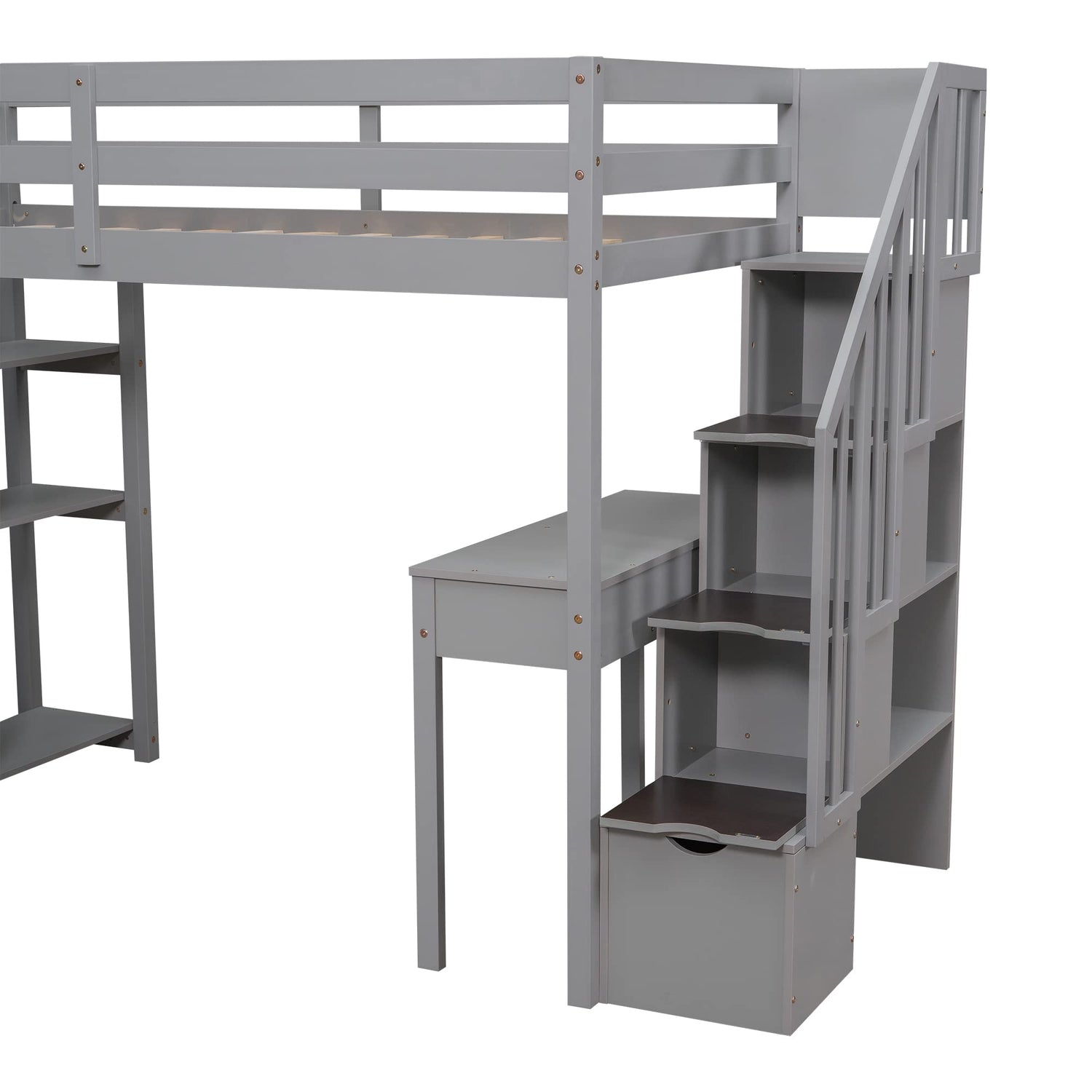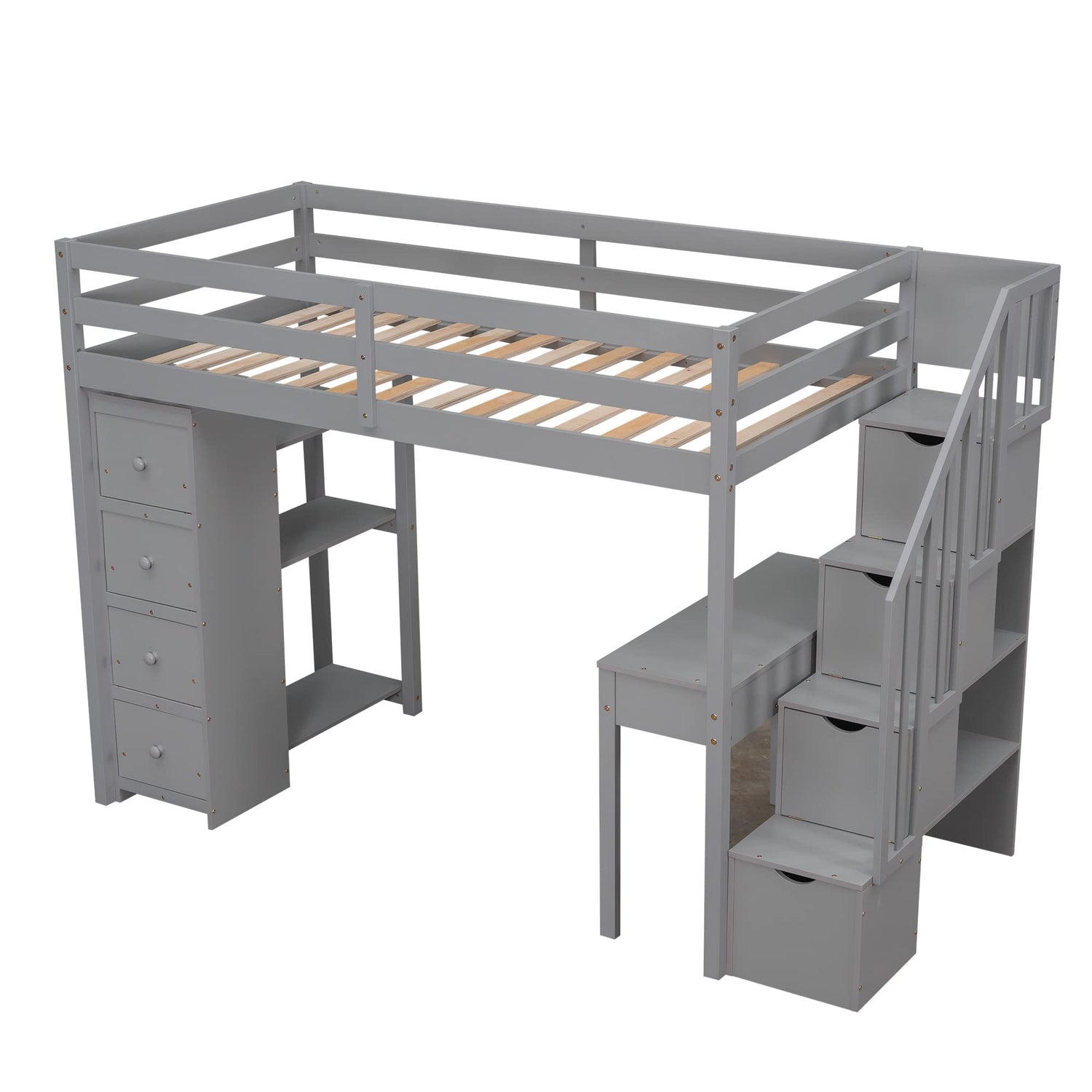 Bellemave Twin Loft Bed with Stairs, Desk, and Storage Drawers - Modern Gray Wood Frame for Kids and Teens