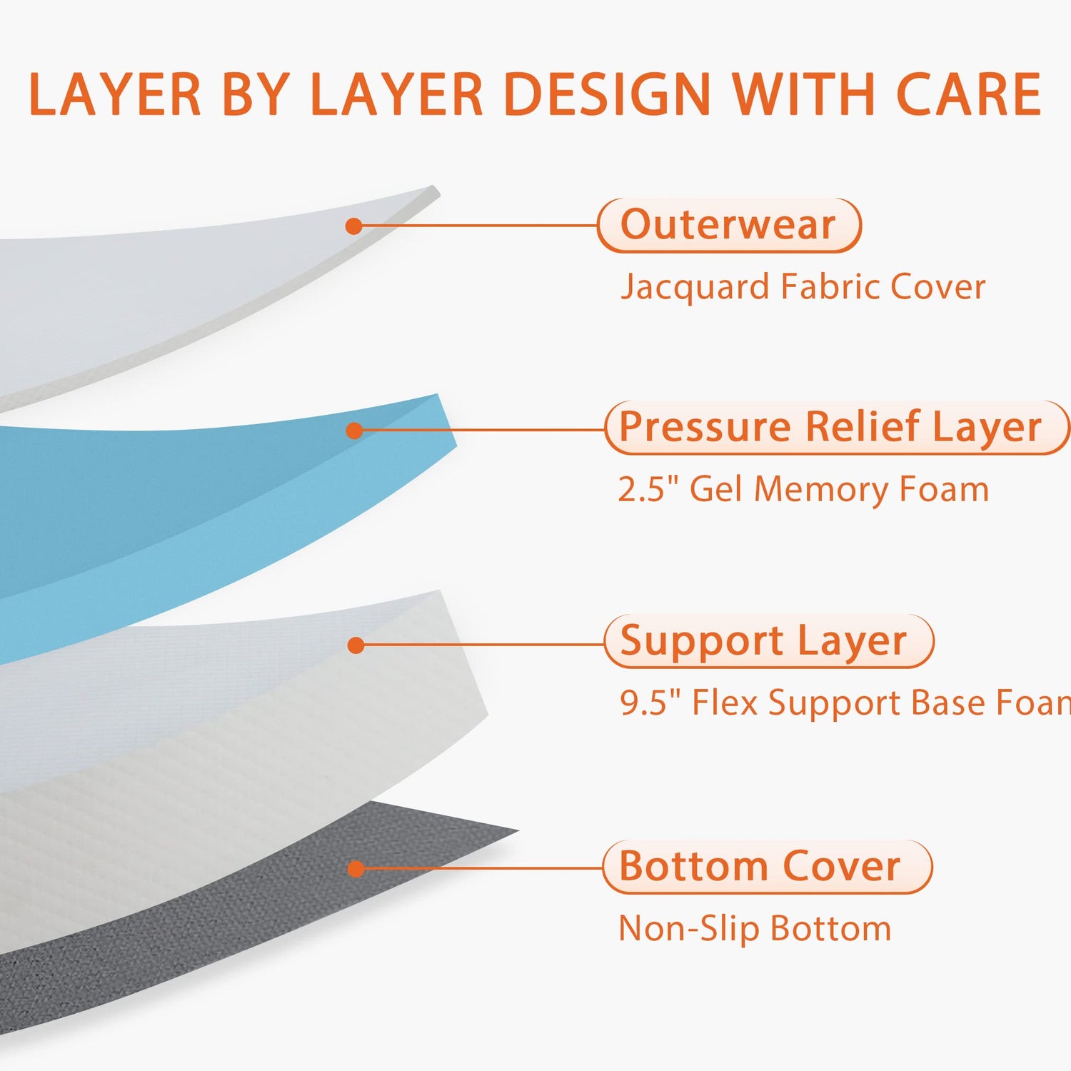 - 🛏︎【GEL MEMORY FOAM CONSTRUCTION】 On top is a gel-infused memory foam that keeps you cool. The gel on your twin bed mattress absorbs excess heat while you sleep, allowing you to fall asleep more quickly. The second layer of the twin size mattresses is high-density support foam, which provides support more in line with the body curve, neither too firm nor too soft. The mattress in a box offers complete, luxurious and stress-free support.