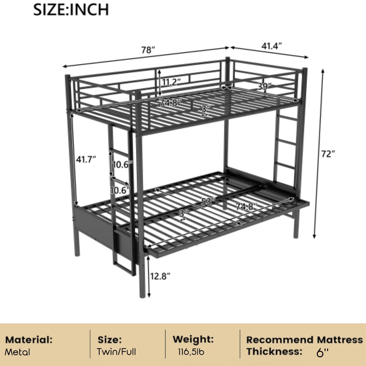 Twin Over Futon/Full Bunk Bed, Bed Frame with Sturdy Steel Frame, Convertible Metal Bunk Bed Couch and Bed with Guard Rail Ladder for Kids Adults Teens,Black