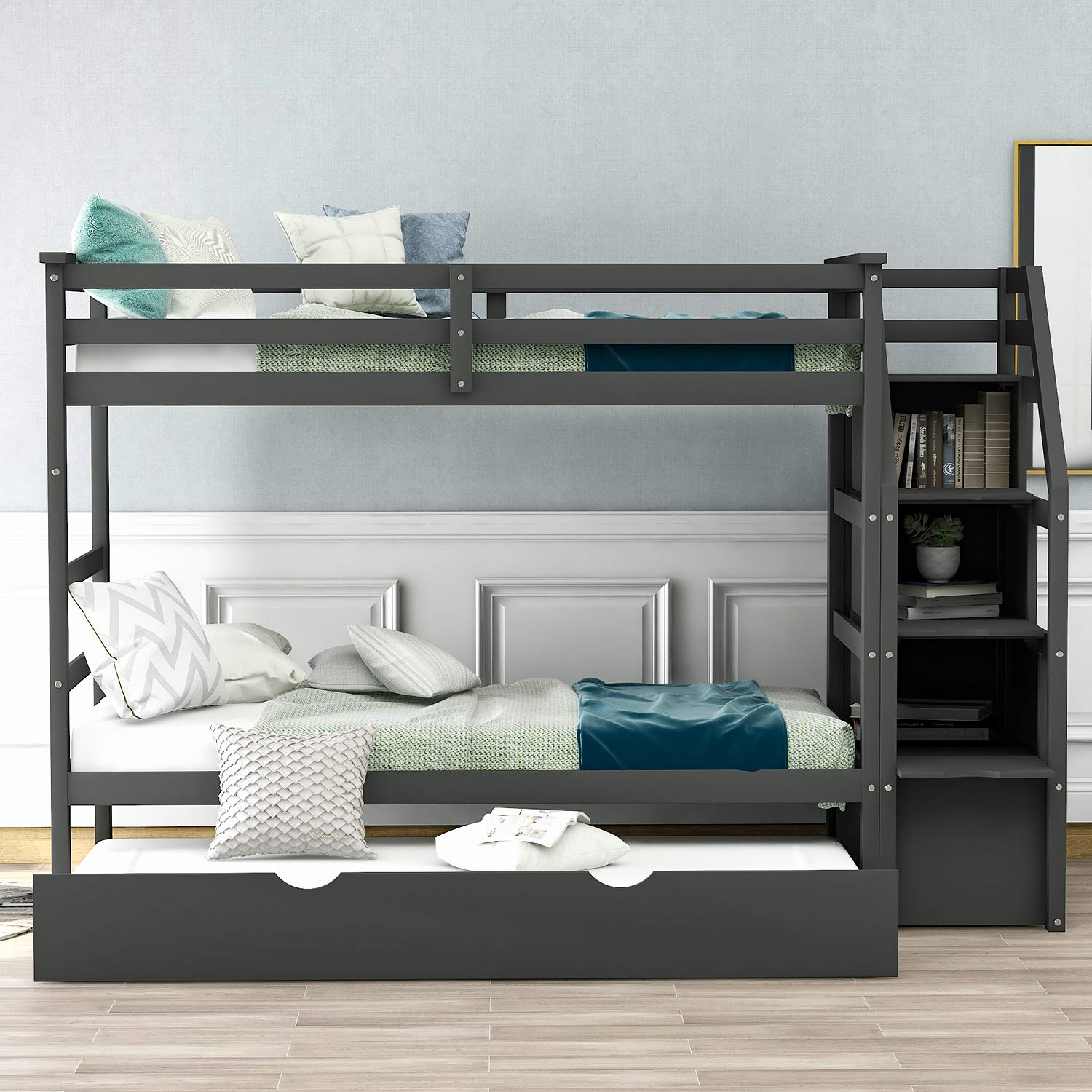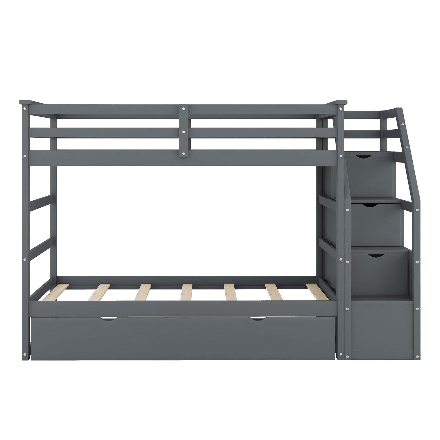 Twin-Over-Twin Bunk Bed with Trundle Bed, Wood Bunk Bed Frame with 3 Storage Stairs and Guard Rail, Space-Saving Design (Grey)