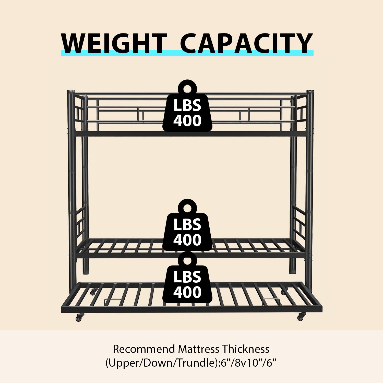 - METAL FRAME TWIN BED: The bunk bed with stairs is made of sturdy metal with built-in reinforced metal slats for tremendous support. The twin frame definitely stands the test of time. Upper bunk holds 400 lbs, lower bunk holds 400 lbs. the trundle holds 300 lbs