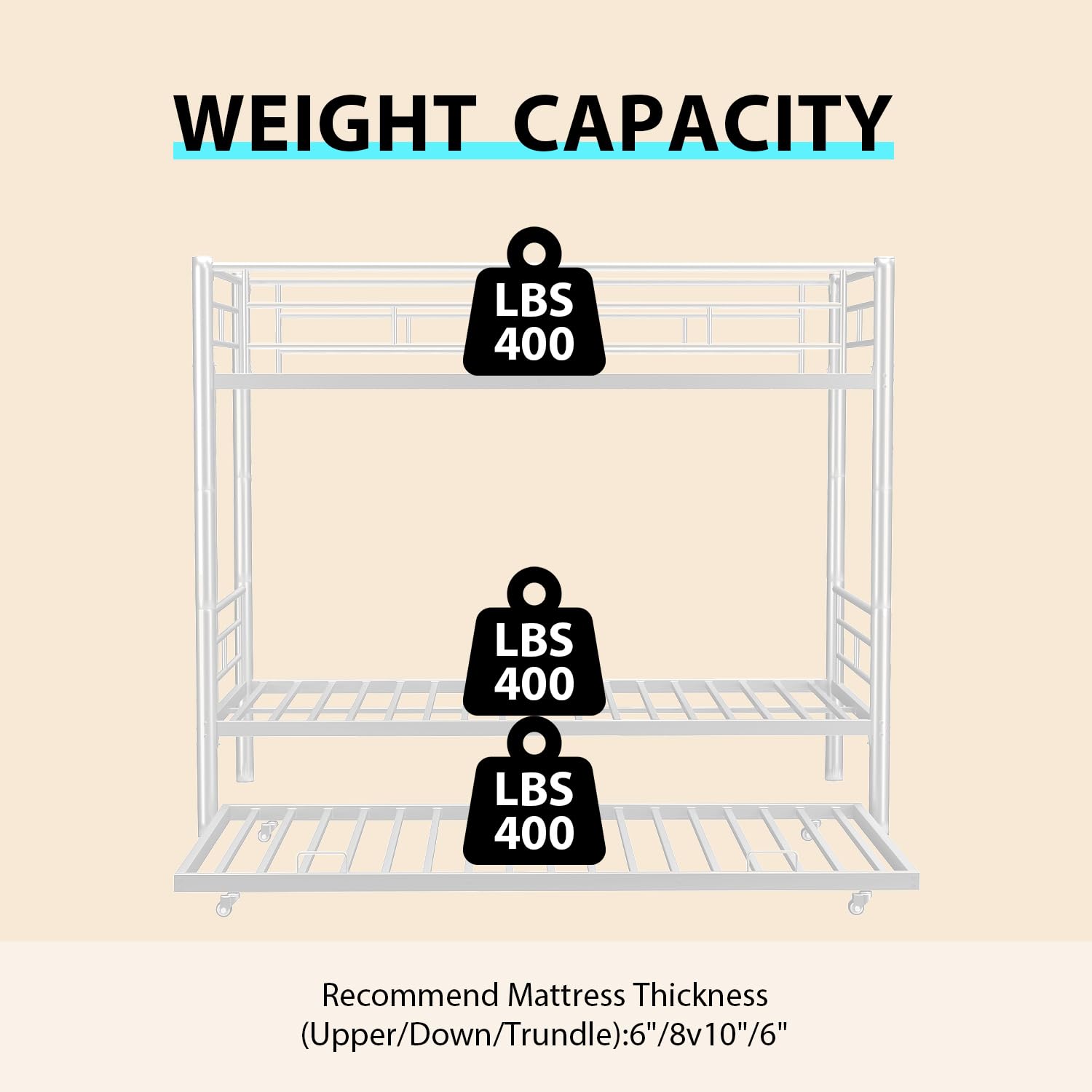 - METAL FRAME TWIN BED: The bunk bed with stairs is made of sturdy metal with built-in reinforced metal slats for tremendous support. The twin frame definitely stands the test of time. Upper bunk holds 400 lbs, lower bunk holds 400 lbs. the trundle holds 300 lbs