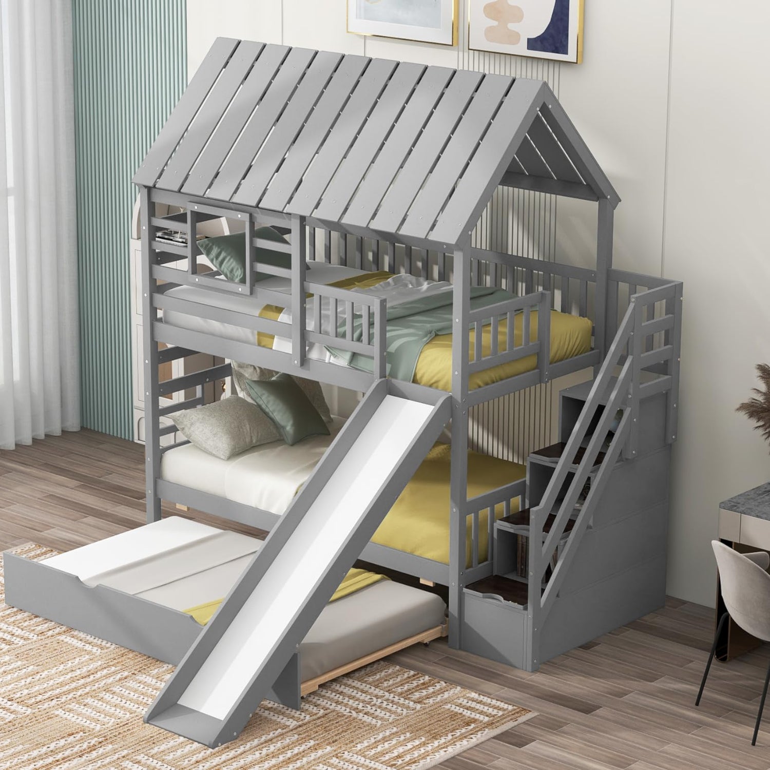 Twin Over Twin House Bunk Bed Frame for Boys Girls Kids Adults Toddler with Trundle and Slide, Storage Staircase, Roof and Window Design, Gray