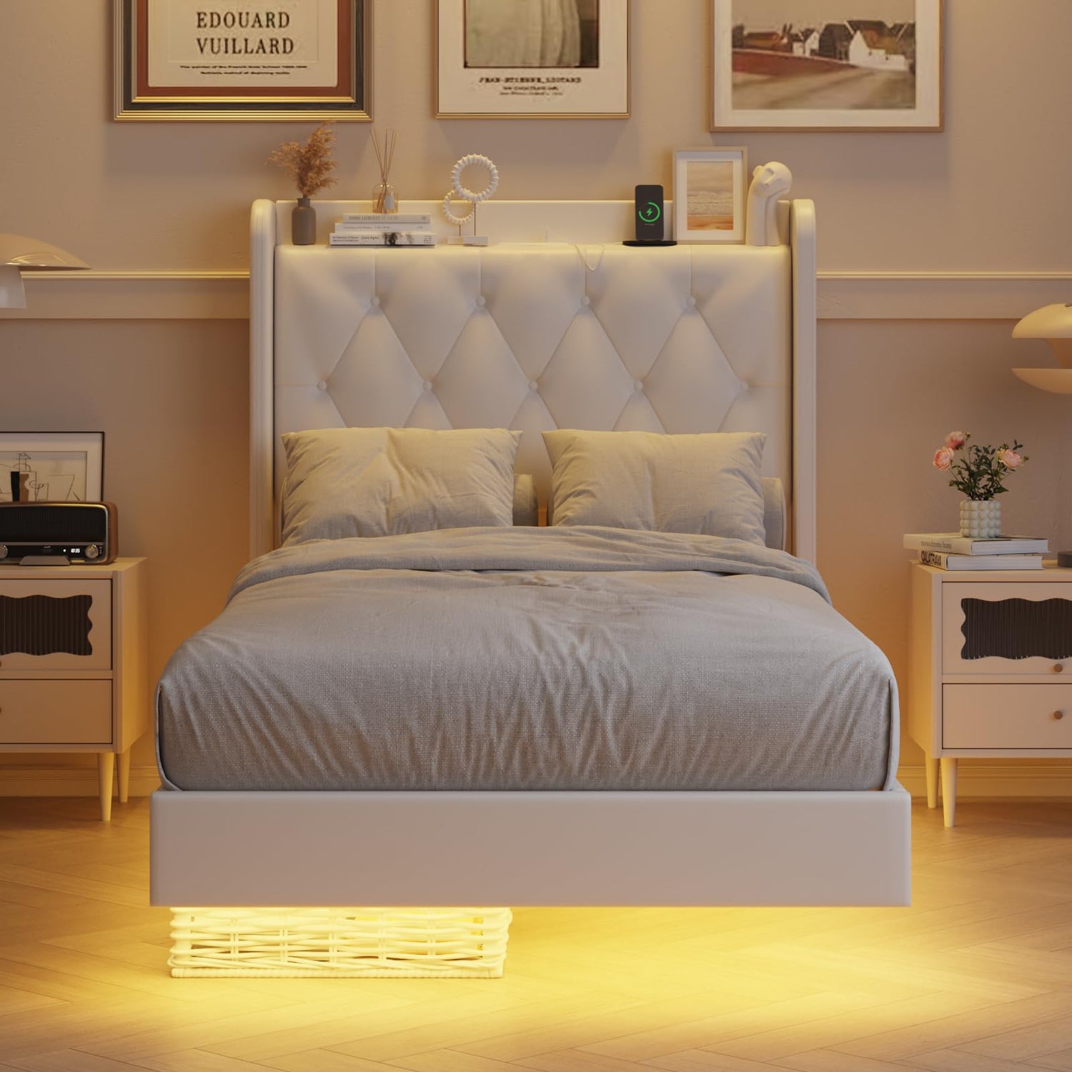 Halitaa Twin Size Floating Bed Frame with LED Lights & Charging Station, White Upholstered PU Leather
