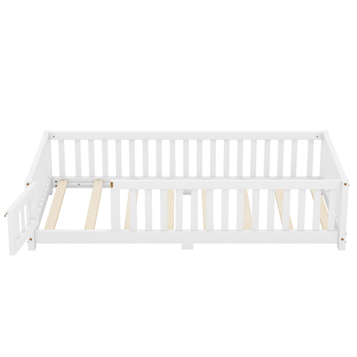 This twin floor bed caters to various needs, thanks to its low height that allows kids to easily get in and out. The removable slats offer versatility, transforming the bed into a playful haven. Your children can enjoy sleep and play seamlessly, using the cute fenced railing as part of their imaginative adventures.