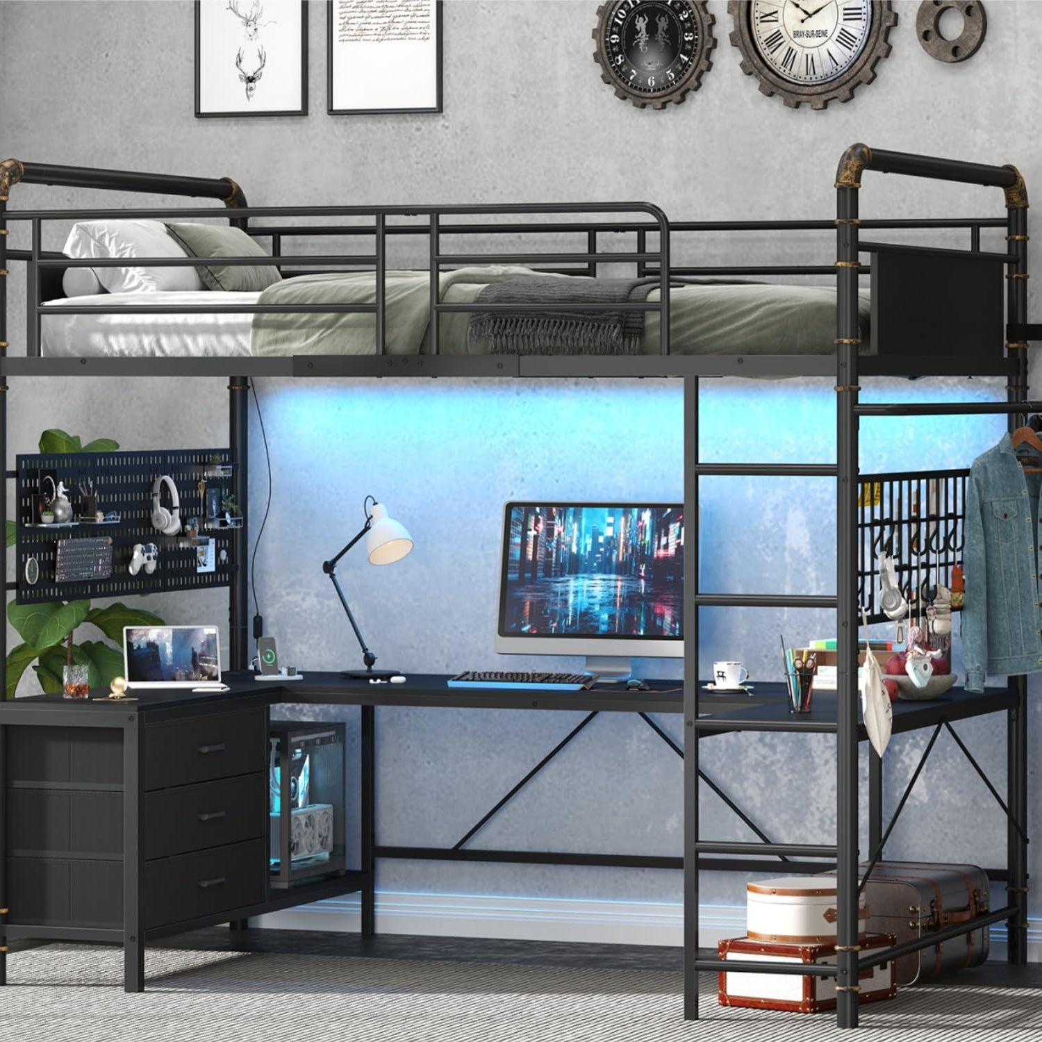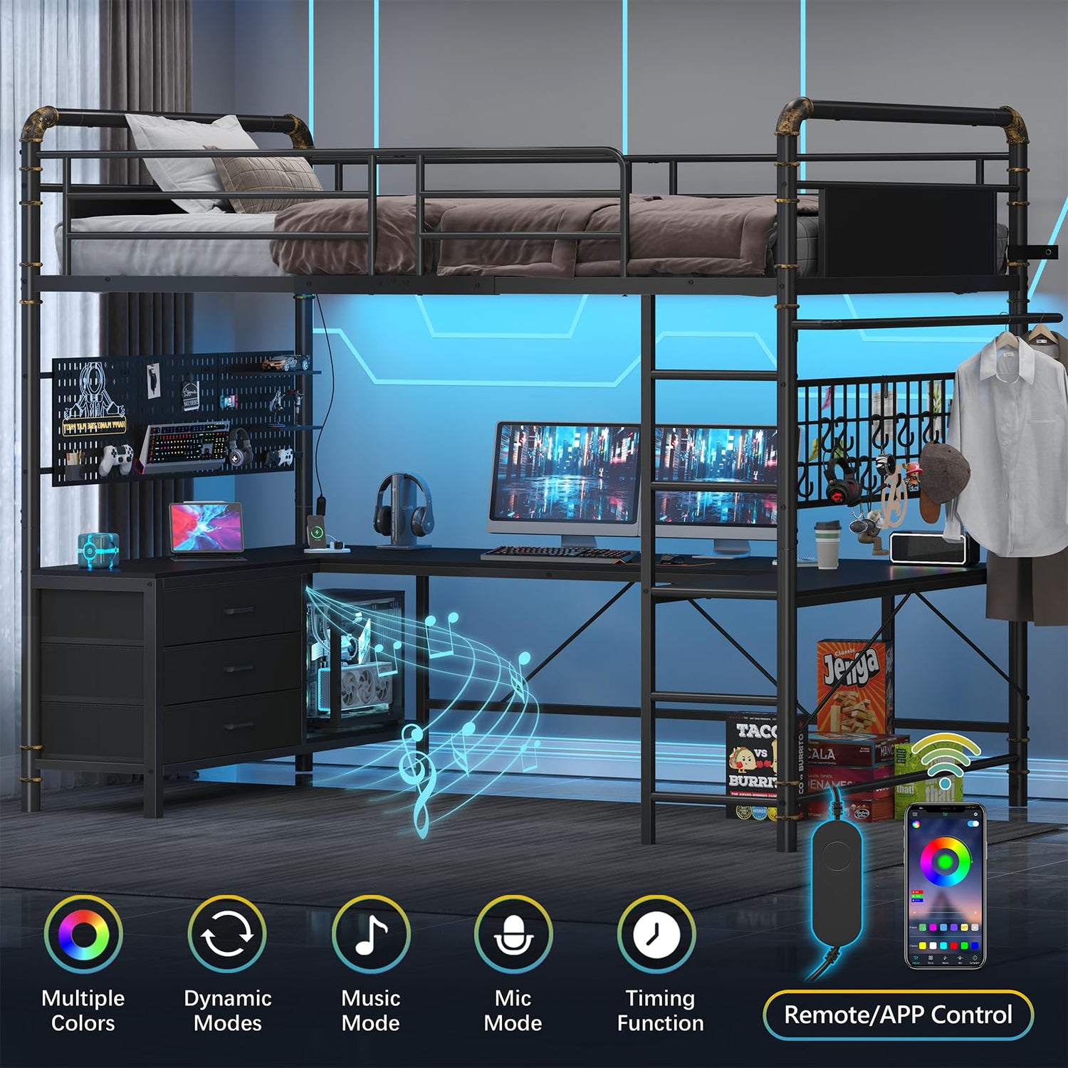 Twin Size Loft Bed with U-Shaped Desk & RGB LED Lights, Twin Loft Metal Bed Frame with Charging Station Bunk loft bed with 3 Drawers, Safety Guard & Ladder, 3 Pegboards, No Box Spring Needed, BlacK