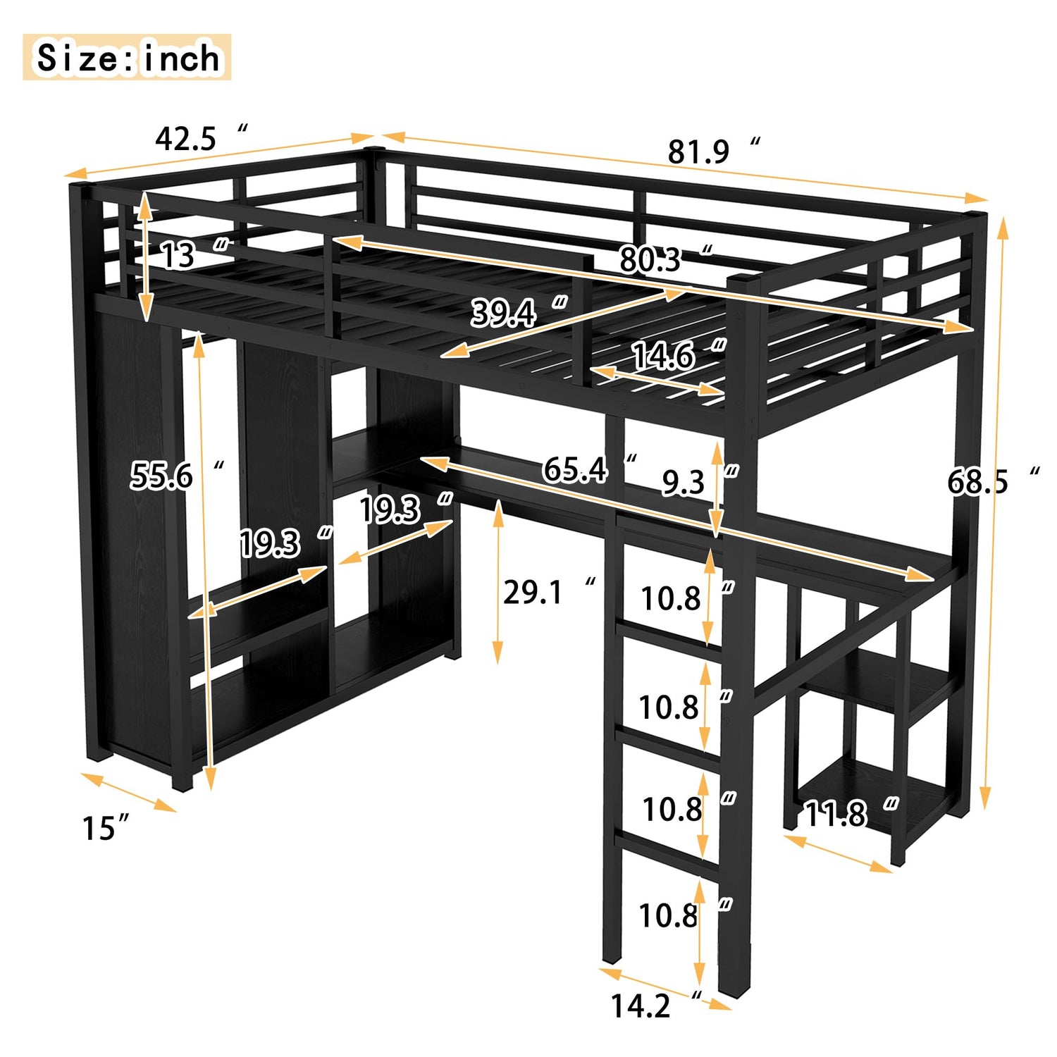 Twin XL Loft Bed with Desk and Storage Shelves, Twin XL Loft Bed with Wardrobe, Hanging Rod and Guardrail and Ladder, Balck