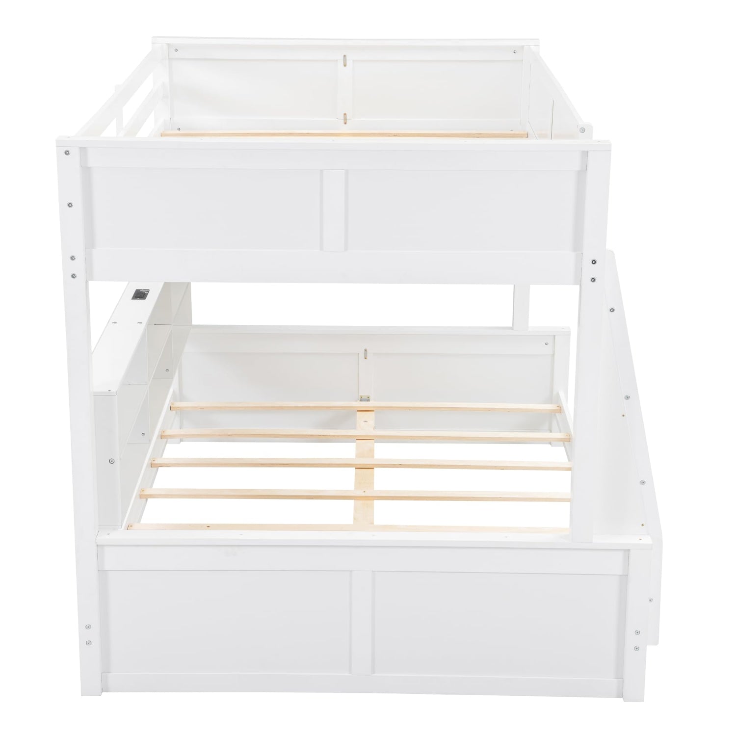 Twin XL Over Queen Bunk Bed with Storage Cabinets and USB Ports, Solid Pine Wood Frame, Safety Guard Rails, No Box Spring Needed (Antique White1, Twin XL Over Queen)
