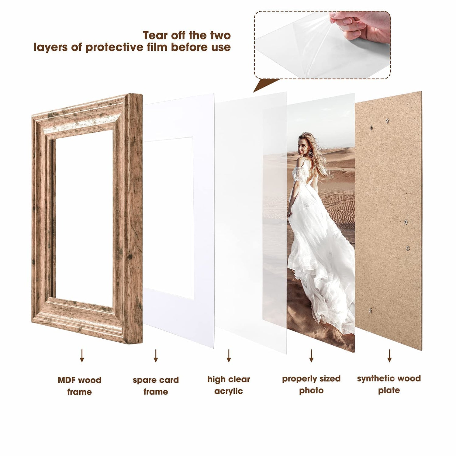 - Top-Quality Materials - These wooden picture frames 5x7 are crafted with the highest quality materials, including solid MDF WOOD and rigid cardboard backing for durability and stability. The crystal clear framing grade acrylic (plexiglass) provides excellent clarity and protection against accidental falls, making them the perfect addition to households. With these frames, you can be assured that your cherished memories are showcased in a beautiful and long-lasting way.
