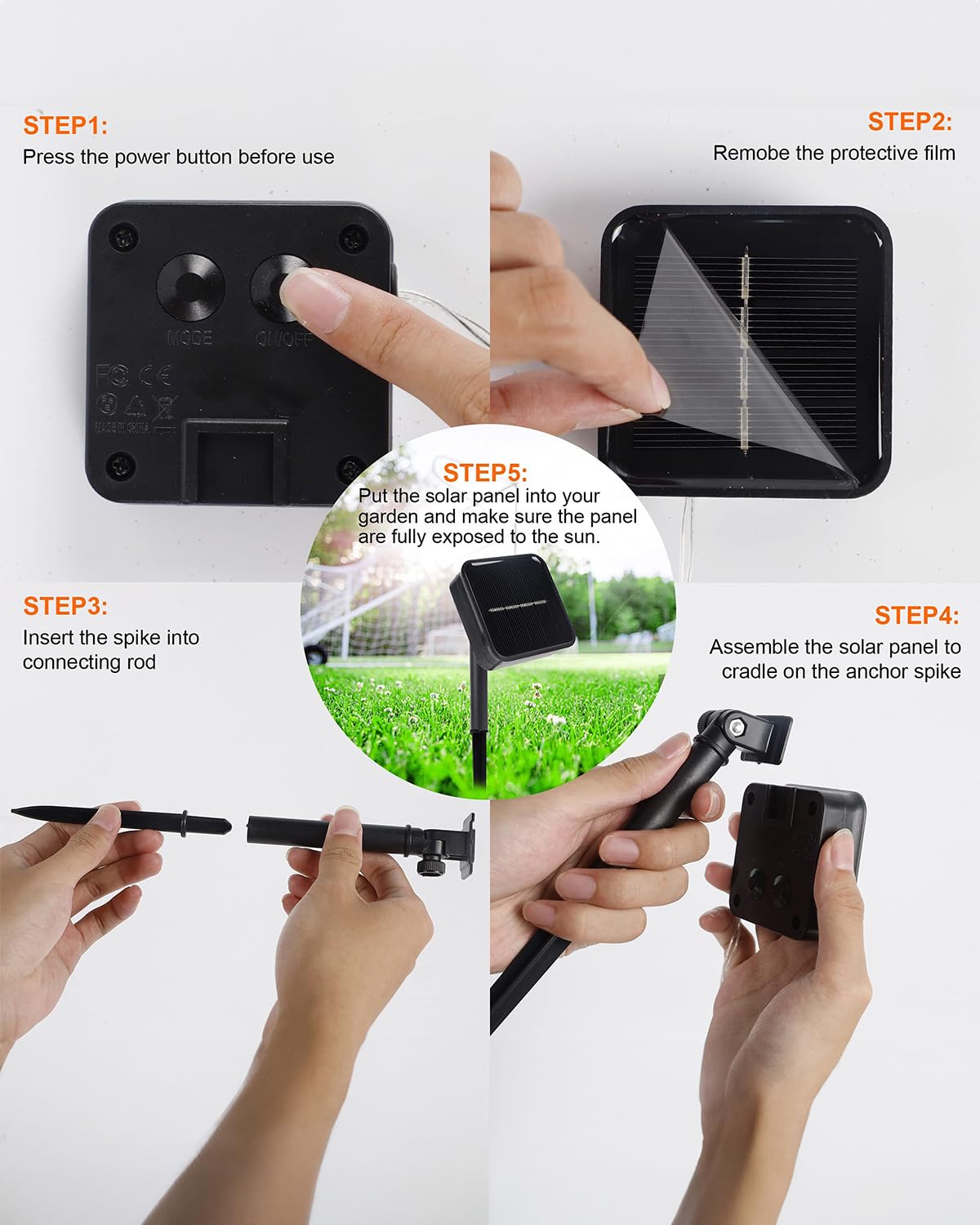 1 . Turn the POWER button ON, then the solar panel can get recharged during the day, and lights can turn on automatically at night.