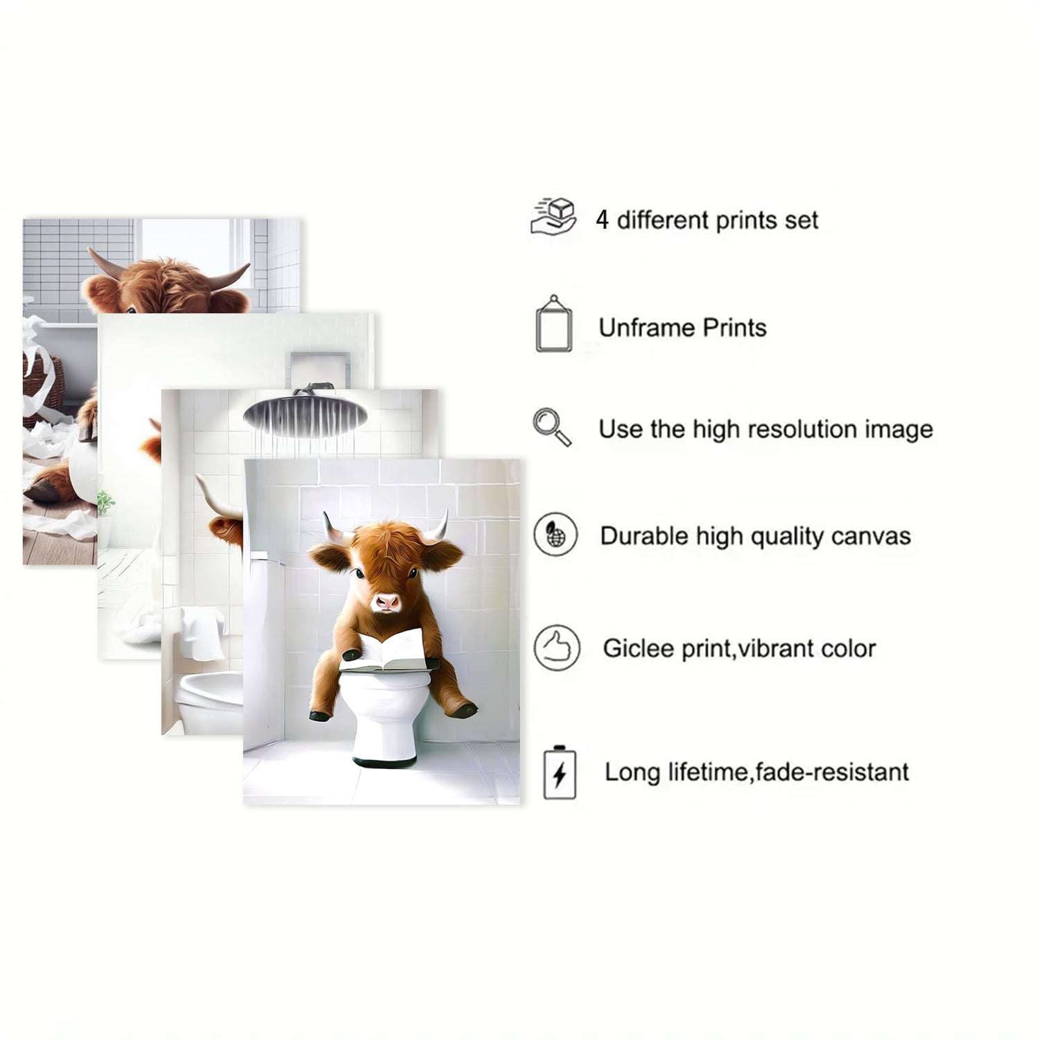 TWNSLLA Highland Cow Funny Bathroom Decor Wall Art,Bathroom Highland Cow Art Prints,Rustic Farmhouse Bathroom Wall Decor,Funny Bathroom Signs Animal Canvas Wall Art,UNFRAMED,8x10inchx4pcs