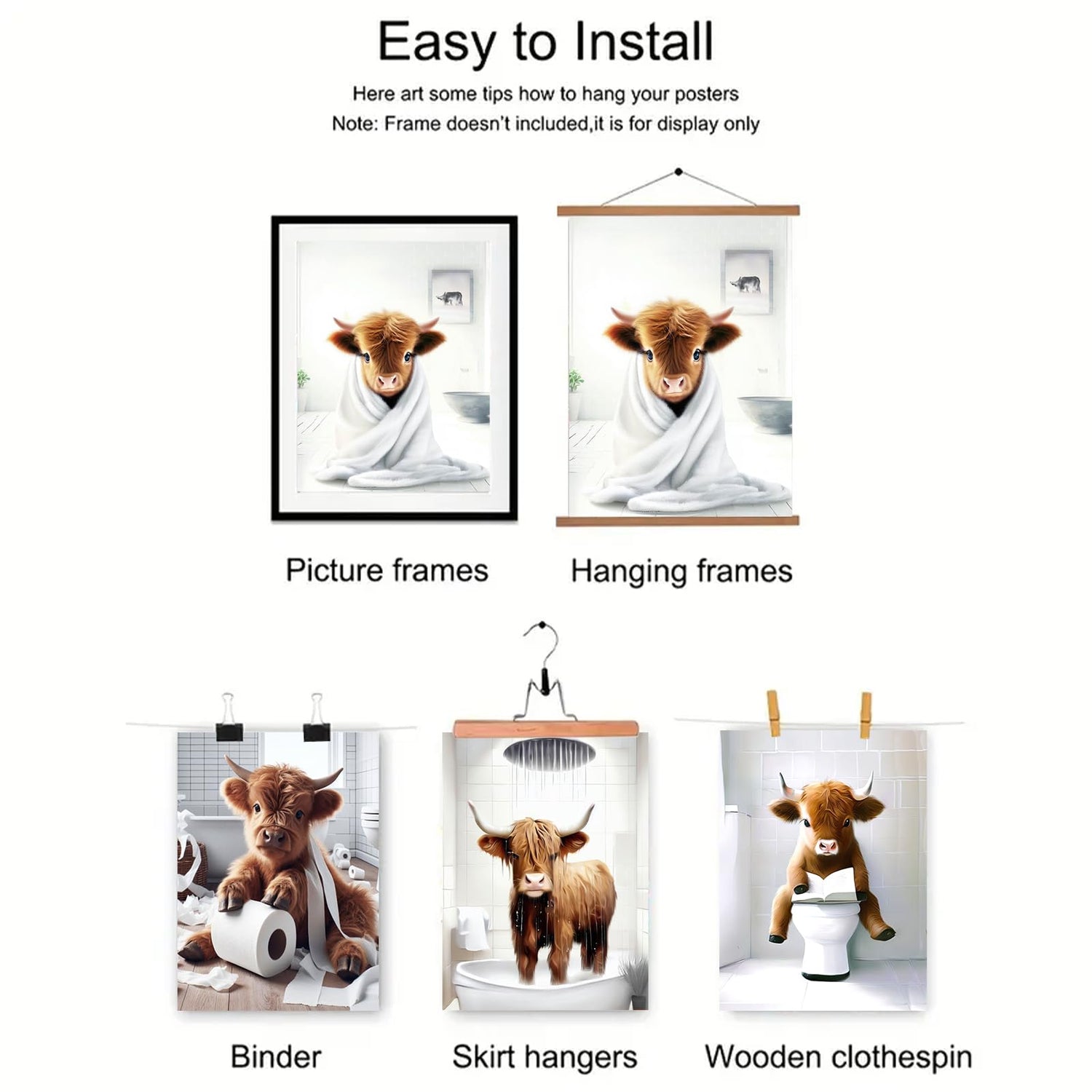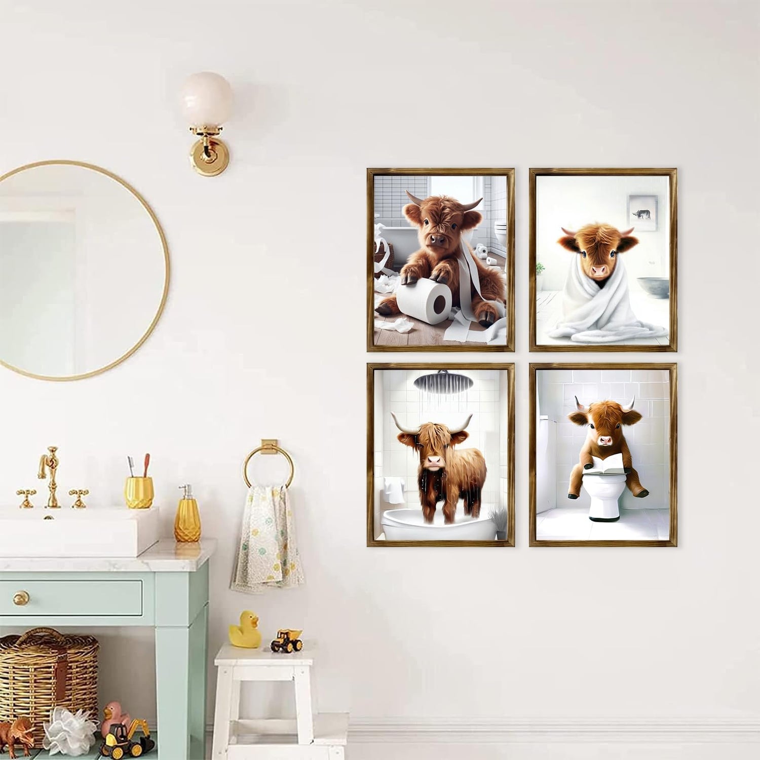 - FUNNY BATHROOM WALL DECOR SIGNS:Add a touch of humor and personality to your bathroom decor with these funny and eye-catching art pieces.These art prints will add rustic charm and whimsy to any bathroom.Ideal for highland cow enthusiasts seeking unique bathroom art.Transform your walls with these playful scenes today!