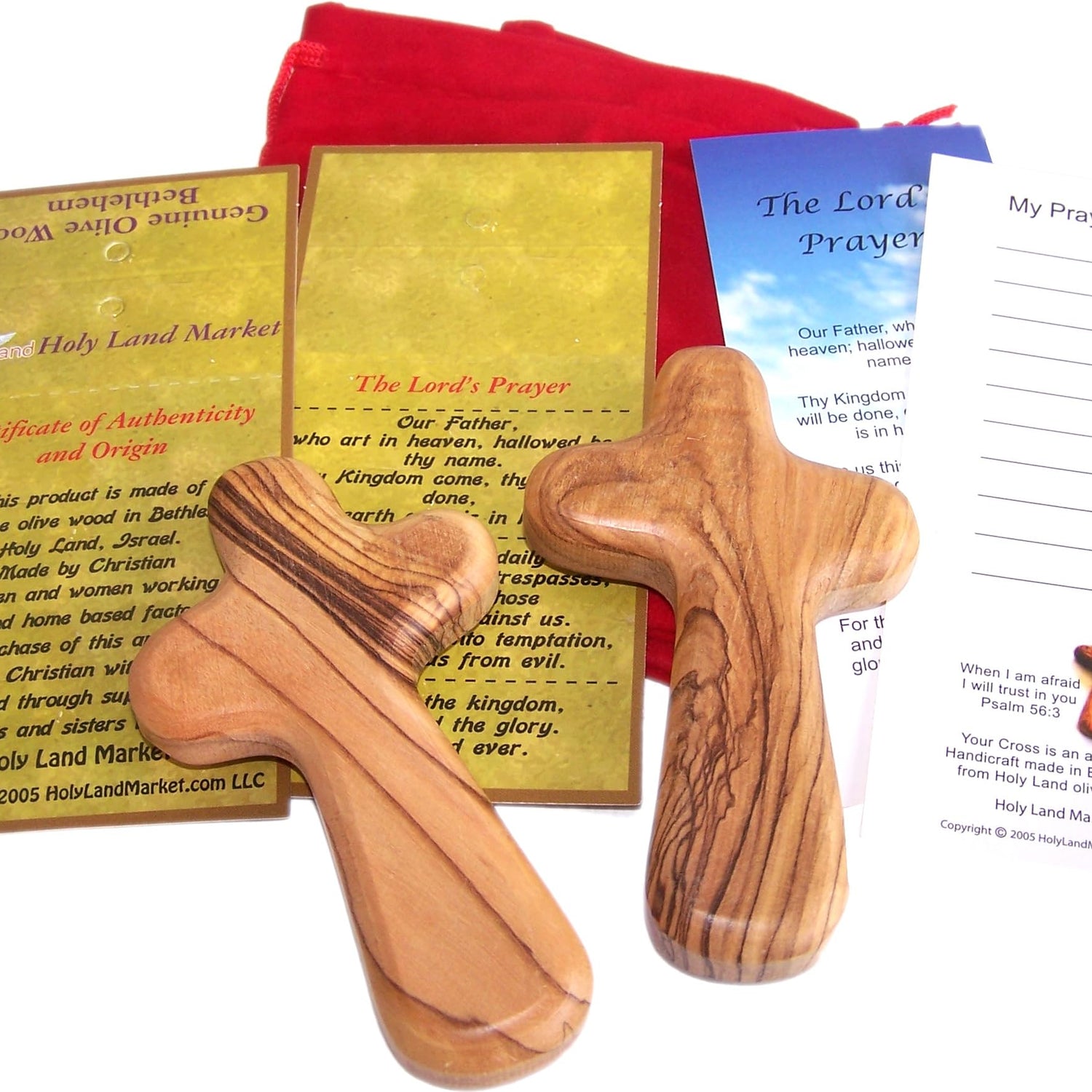 Two Olive Wood Olivewood Comfort Holding Hand Crosses With Gift Bags (With Red or Black Velvet Bag) and a Prayer Card + Certificate.