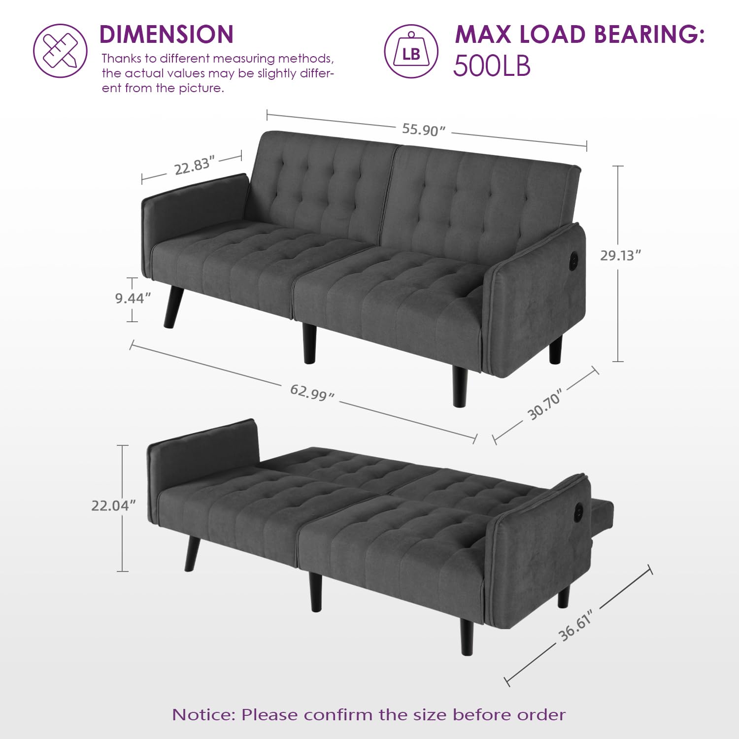 TYBOATLE 65“ Convertible Futon Sofa Bed w/ 2 USB, Upholstered Tufted Small Adjustable Folding Couch Loveseat, Modern Mid Century Sleeper Sofa for Living Room, Bedroom, Apartment, Office (Dark Grey)