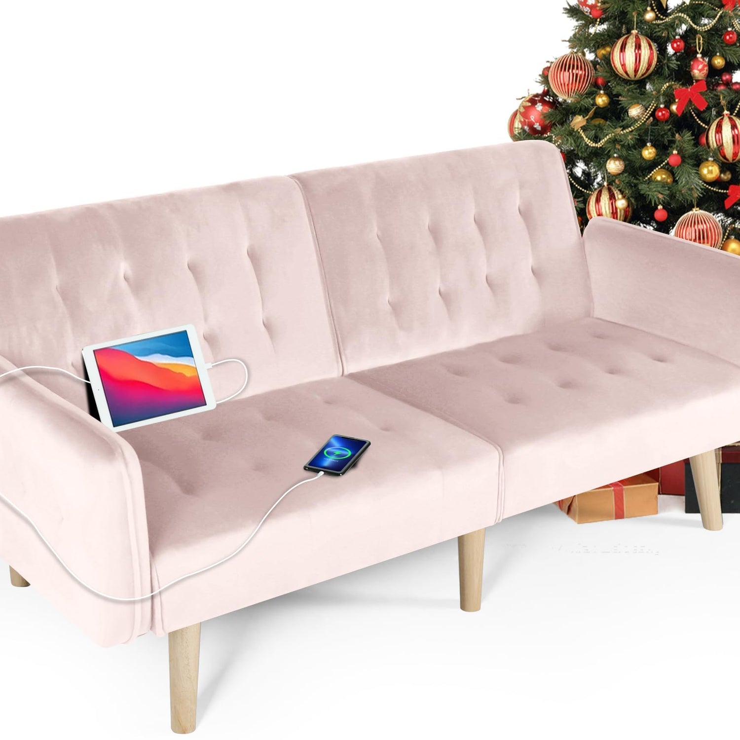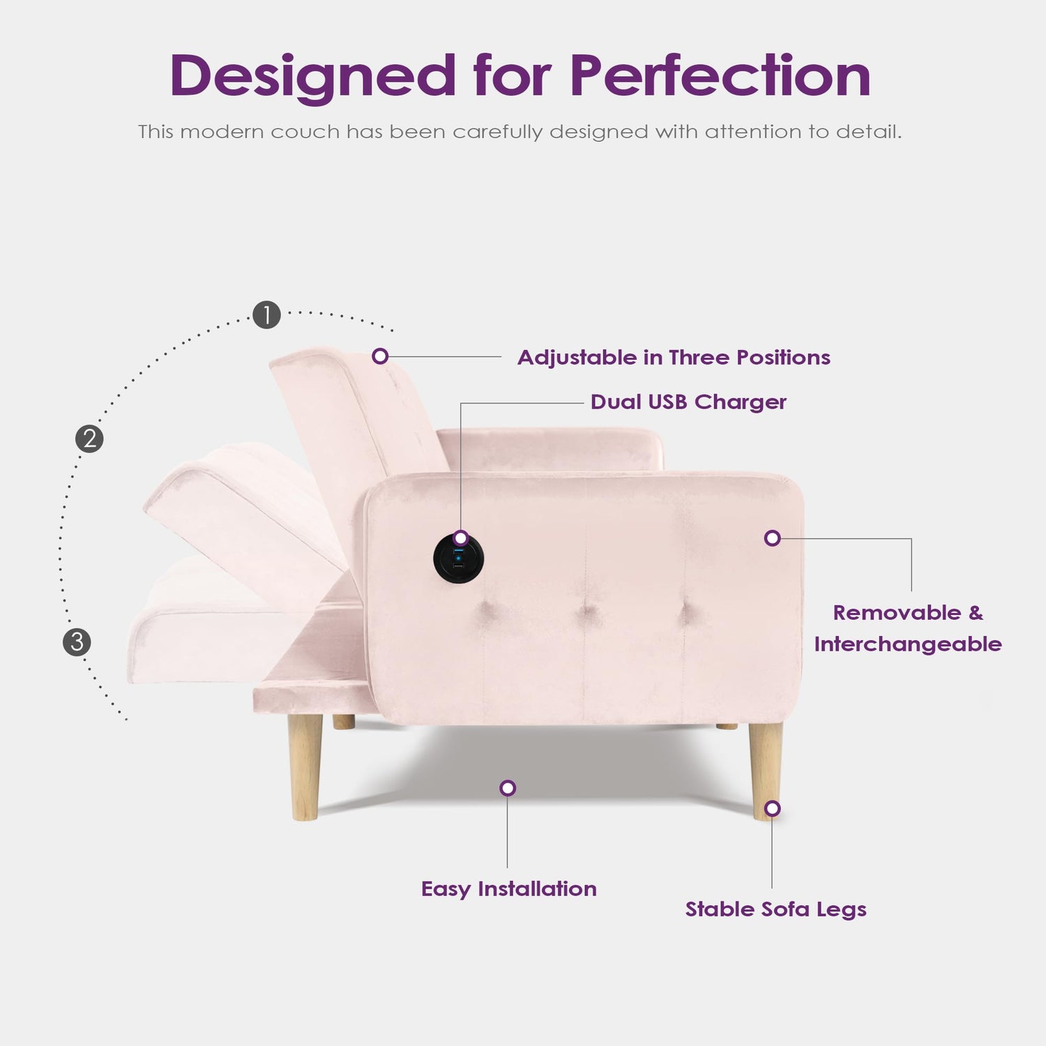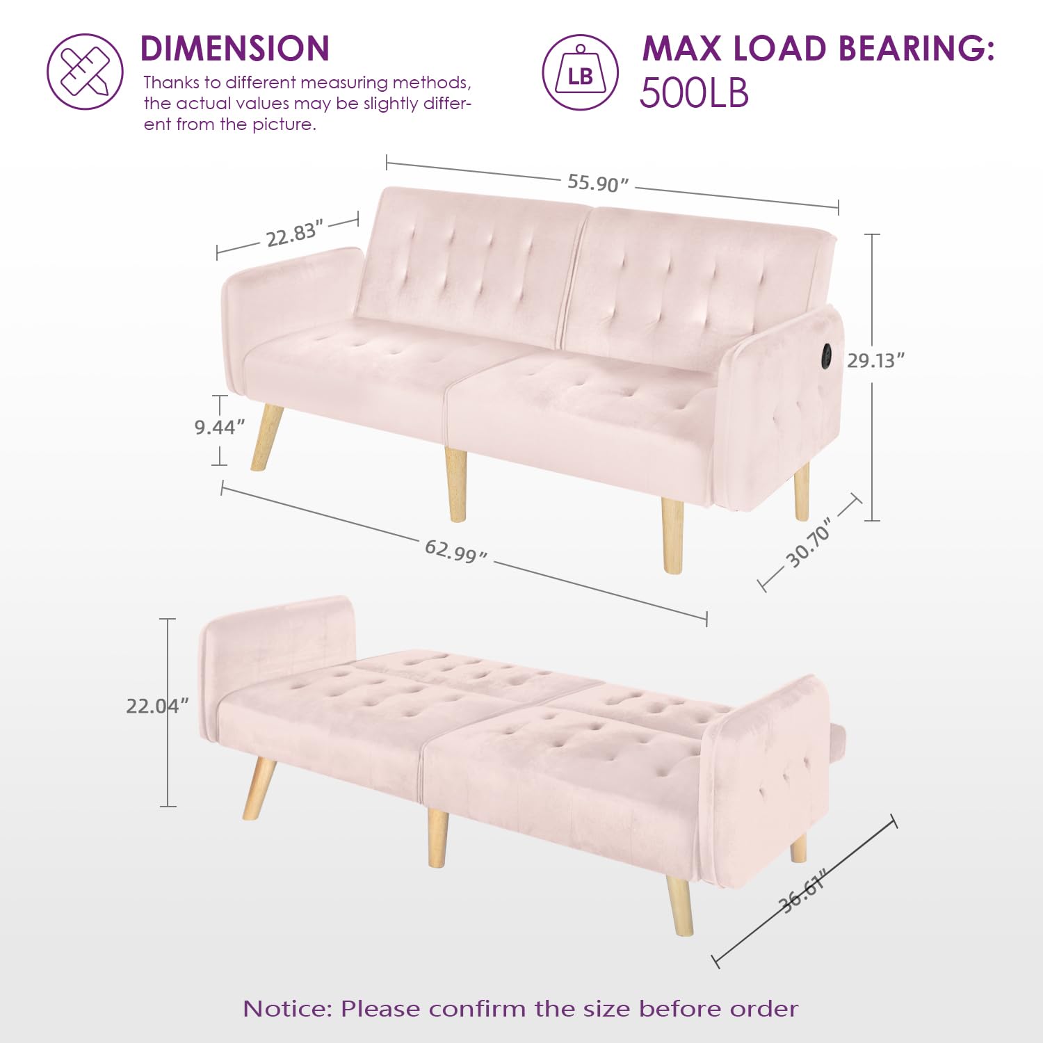 TYBOATLE 65" W Velvet Modern Convertible Folding Futon Couch Sofa Bed w/ 2 USB Charging Ports and arms, Loveseat for Compact Living Space, Dorm, Game Studio, Bonus Room, Apartment, Bedroom (Pink)