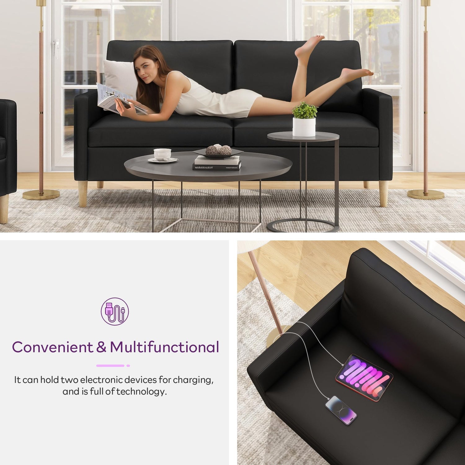 TYBOATLE 66" Black Faux Leather Sofa Couches w/USB, 2 Piece Living Room Set, Mid-Century Modern Tufted Loveseat 2 Seater Office Small Couch Love Seat for Small Space Bedroom Drom Apartment