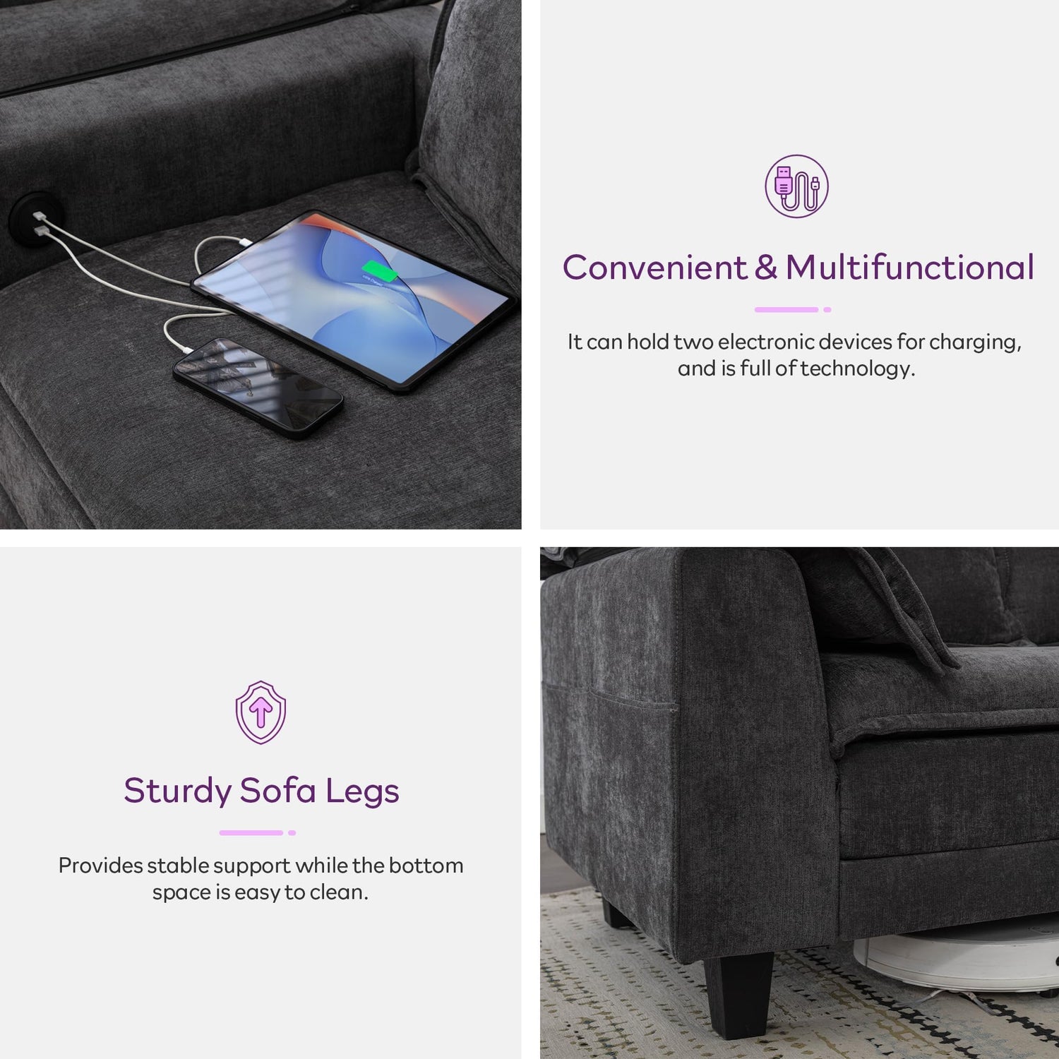 - 【Practical Multifunctional Design】 The large 3 seat couches features removable armrest cushions, equipped with USB and Type-C ports on the armrest, allowing a long-lasting journey for two electronic devices at once. The storage pockets on both side make love seat easy to keep the areas around the grey sofa tidy. Store things you want easily accessible yet still hidden.