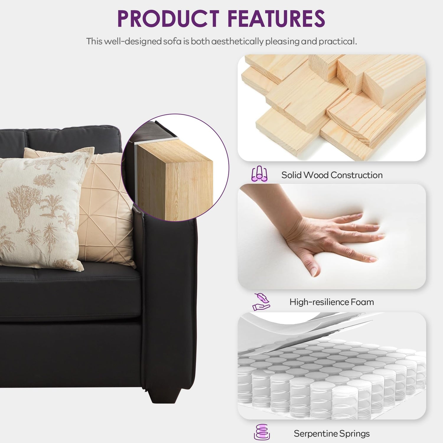 - 【Comfortable Cushion】Sofa seat cushions we use high elasticity high rebound sponge and s-type spring, enhance the overall sitting and comfort of the sofa, when you touch the sofa cushions, you will feel the amazing sense of wrapping, you can fully relax on the sofa to rest. The frame of the sofa is made of high quality solid wood and metal to ensure that every part of the sofa is strong and durable, and the sofa can bear the weight of the sofa evenly.