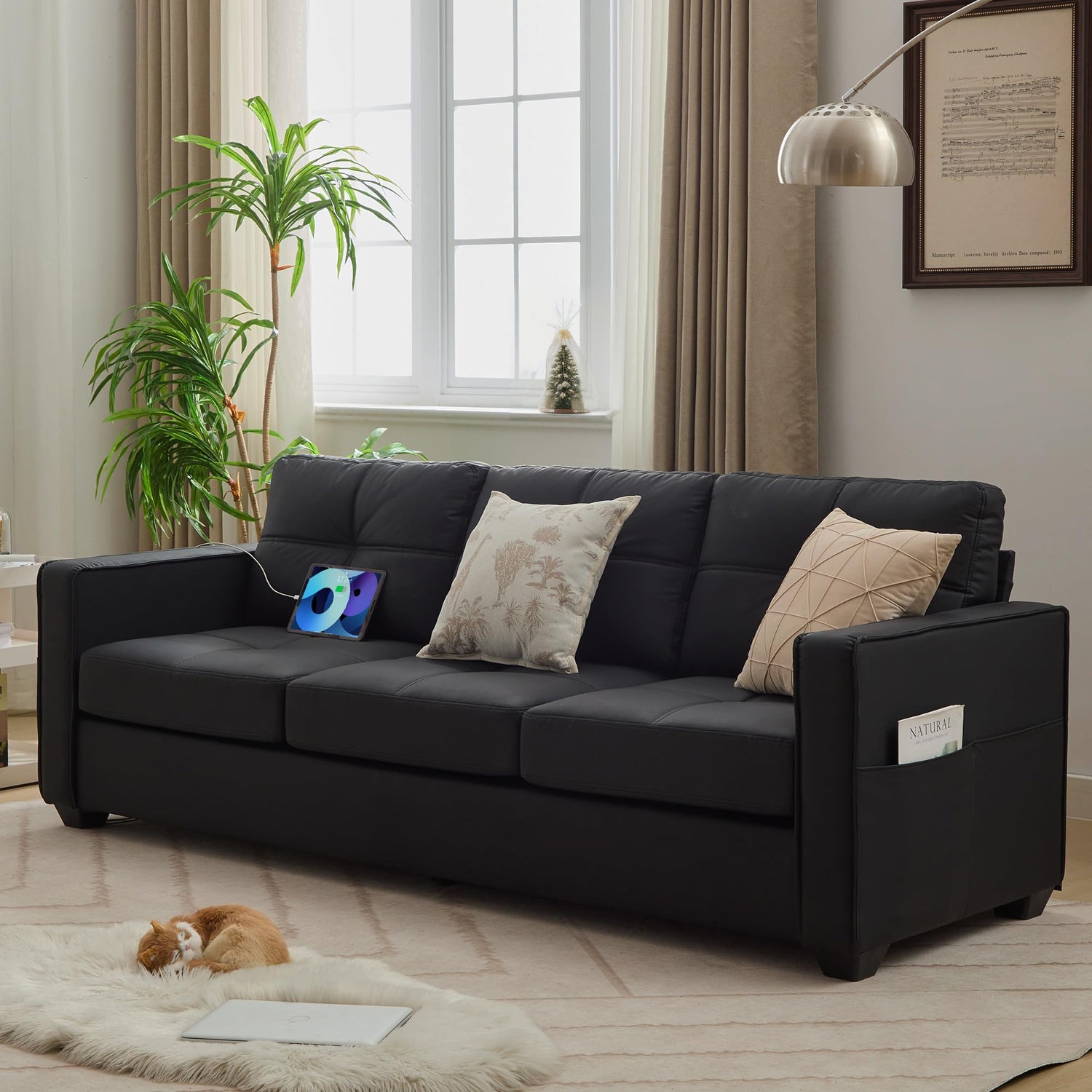 TYBOATLE 88" W Faux Leather Couches for Living Room w/Side Pockets, Mid-Century Modern Tufted Comfy Leather Couch w/USB and Wider Arms, 3 Seater Sofa for Office, Apartment, Bedroom, Black