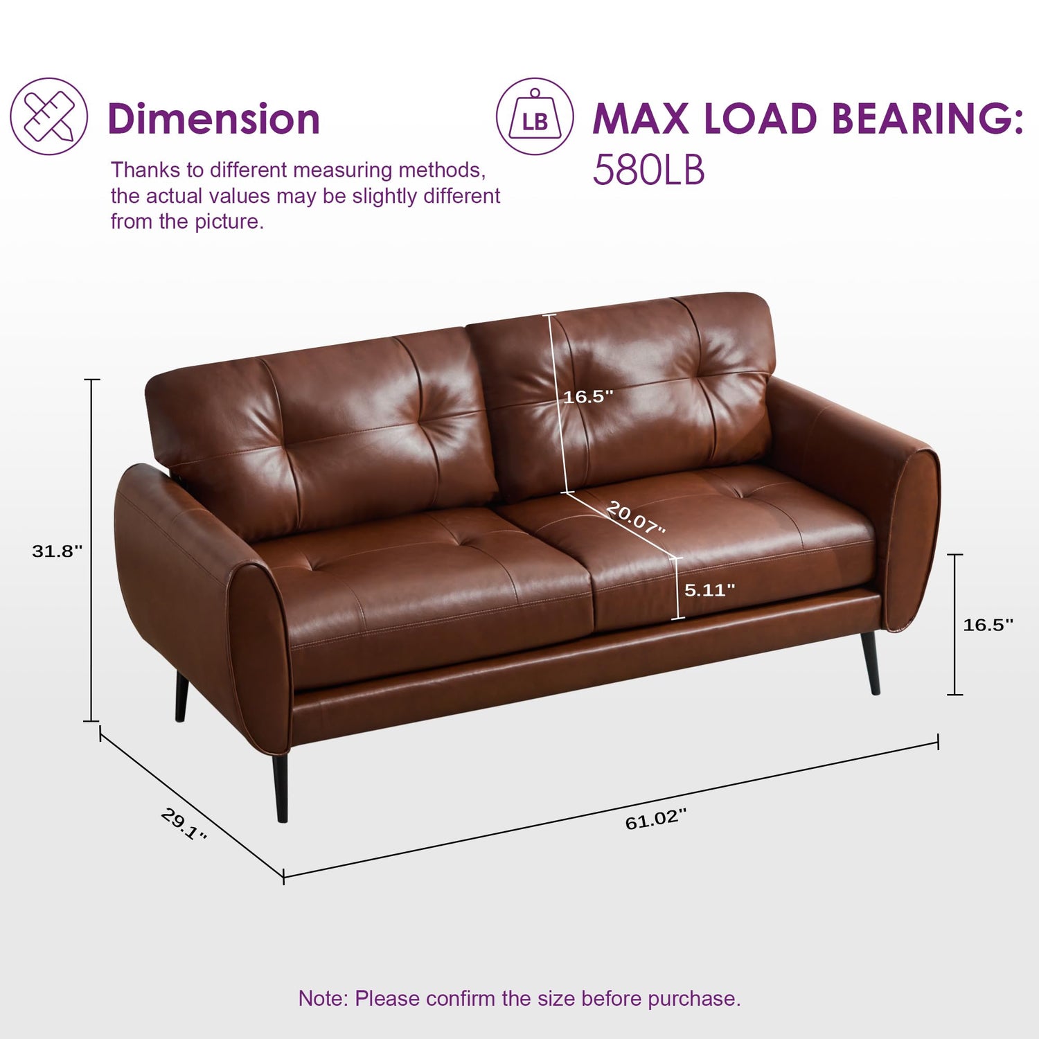 TYBOATLE Sofa Couch 61" Small Loveseat Couches for Living Room Leather Couch Mid Century Modern Tufted Mini Sofa Comfy Office 2 Seat Settee Love Seat Loveseat for Small Spaces Bedroom (3, Brown)