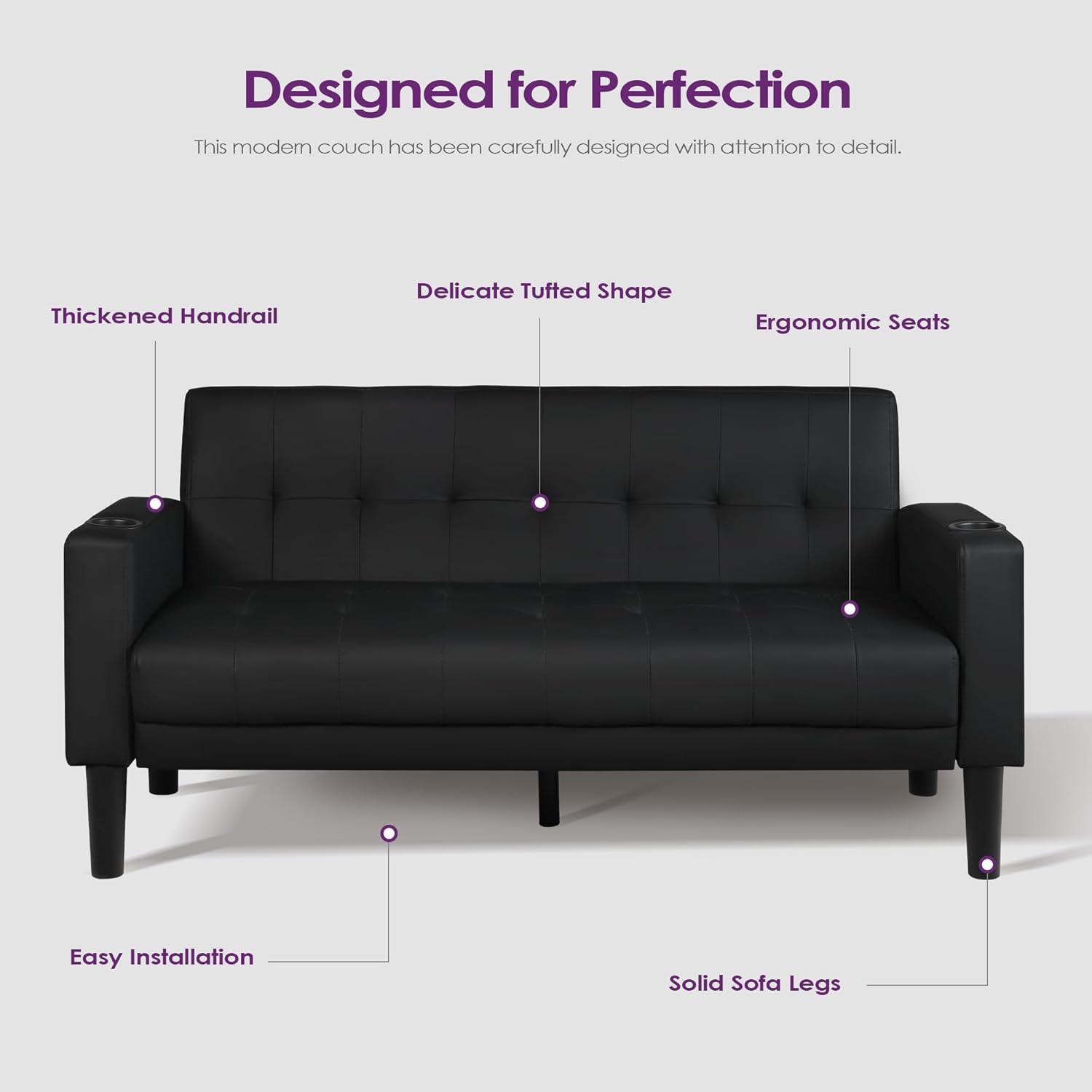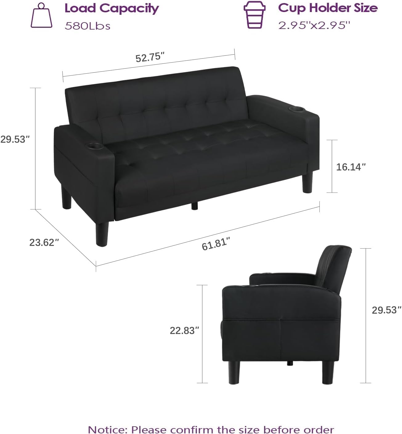 TYBOATLE Sofa Couch 62" W Loveseat w/ 2 USB Charger Ports & 2 Cupholders, Mid-Century Modern Black Faux Leather Tufted Small Love Seat Couches for Office,Compact Living Room,Bedroom,Apartment,Dorm