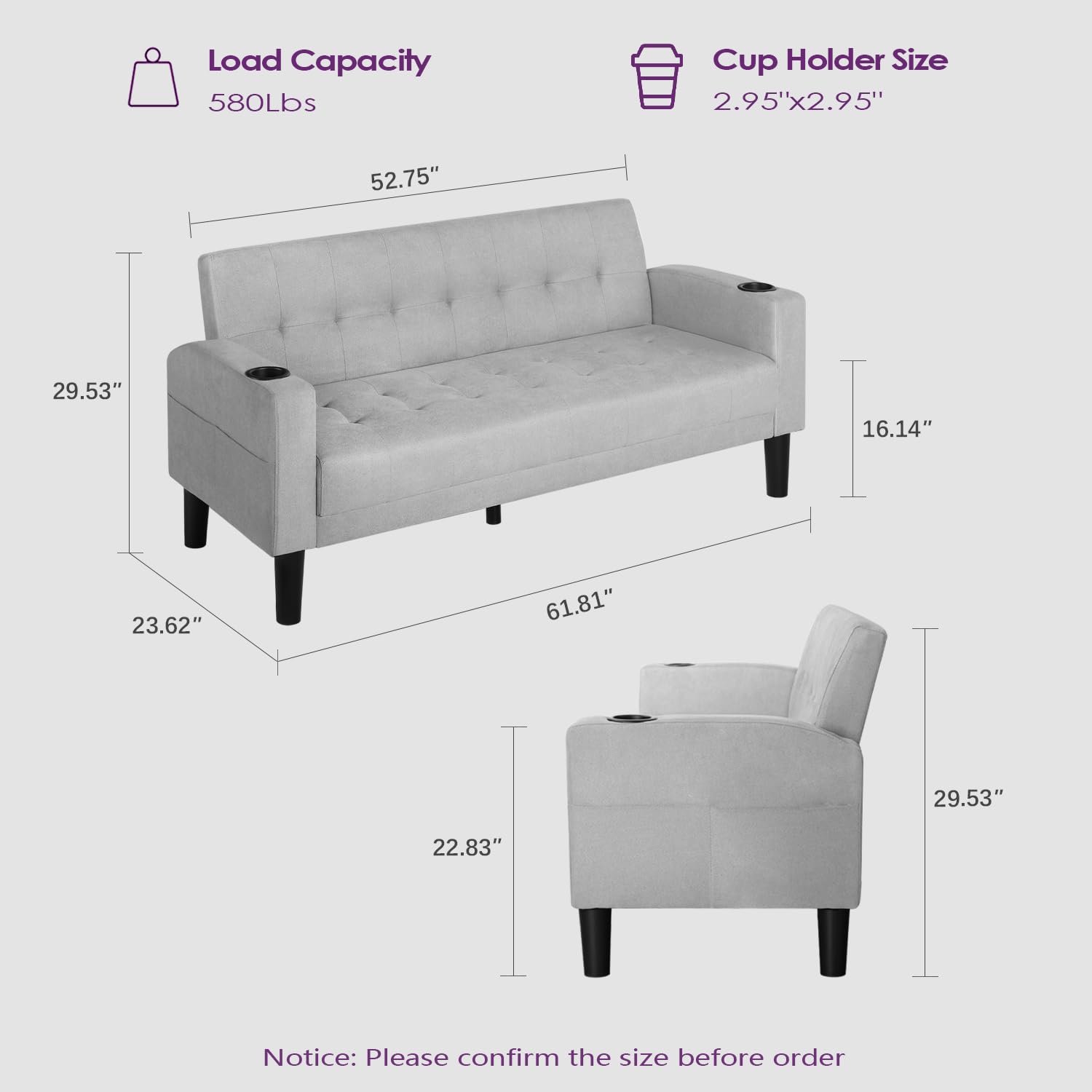 - 【SPECIFICATIONS】61.81"(L) x 23.62"(W) x 29.53"(H); Weight Capacity: 400 lbs. This small sofa is perfect for the office, living room, bedroom, lounge, apartment.