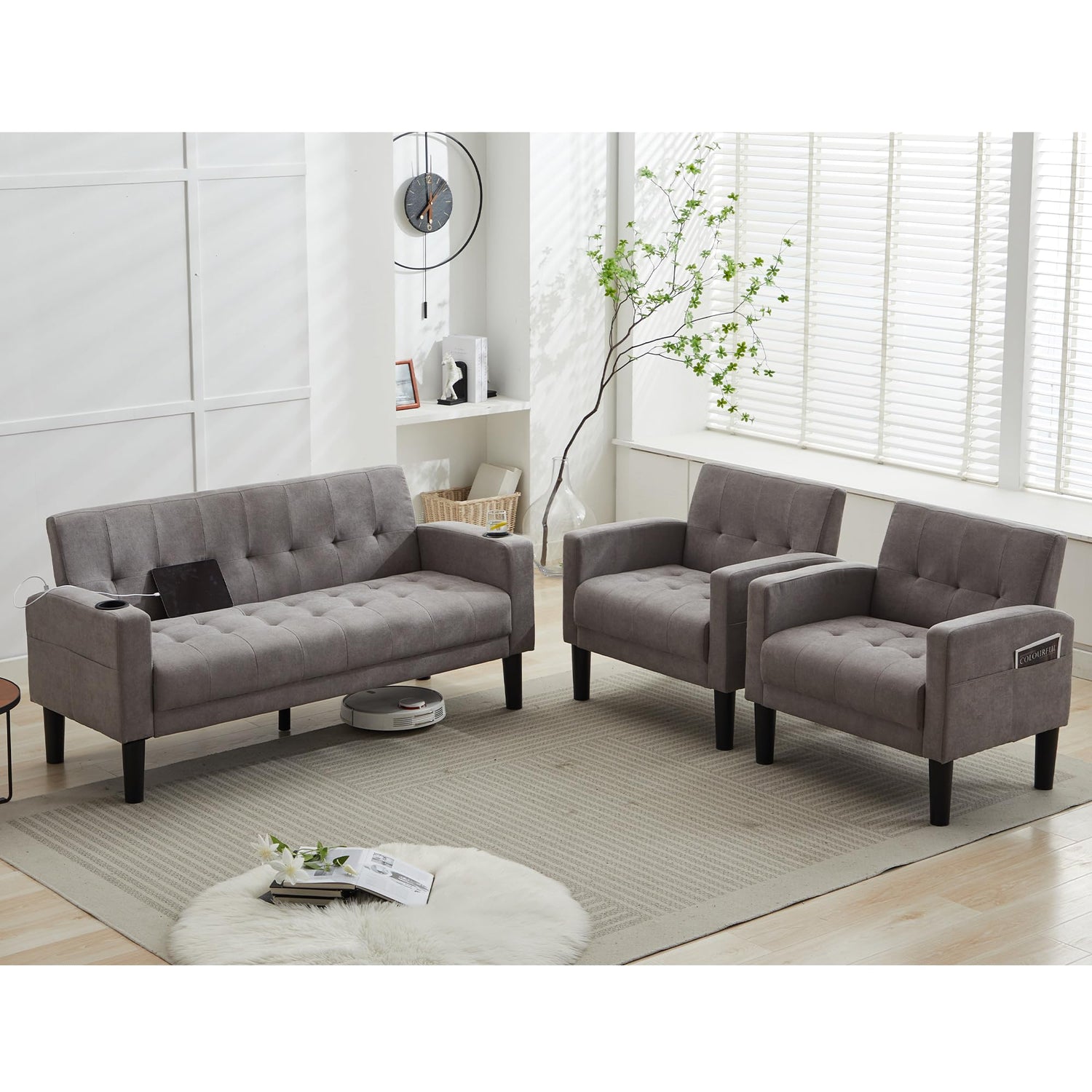TYBOATLE Sofa Couch, Living Room Furniture Sectional Sofa Sets 3 Pcs, Tufted Mid-Century Loveseat w/USB, Cupholders & Comfy Single Sofa for Small Space, Apartment, Office (Light Grey)