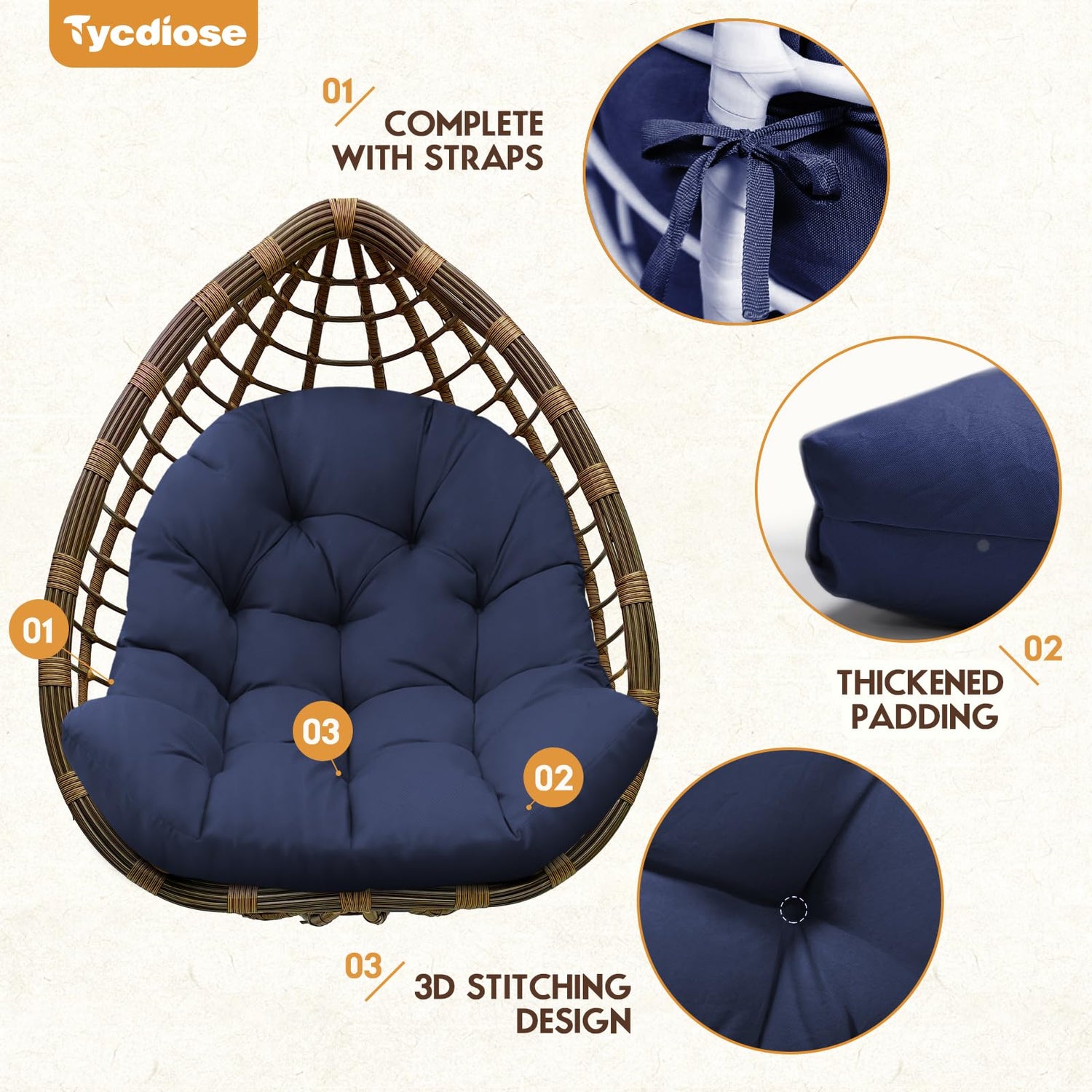 - 🛒【WATERPROOF FABRIC】-Tycdiose egg chair cushion is made of waterproof, UV-resistant Oxford fabric, which is soft and skin-friendly, durable and suitable for indoor outdoor patios, garden porches and sunrooms. Note: If rainwater stays on the 3D seams (grooves) of the egg chair cushion for a long time, it may seep in and wet the egg chair cushion.