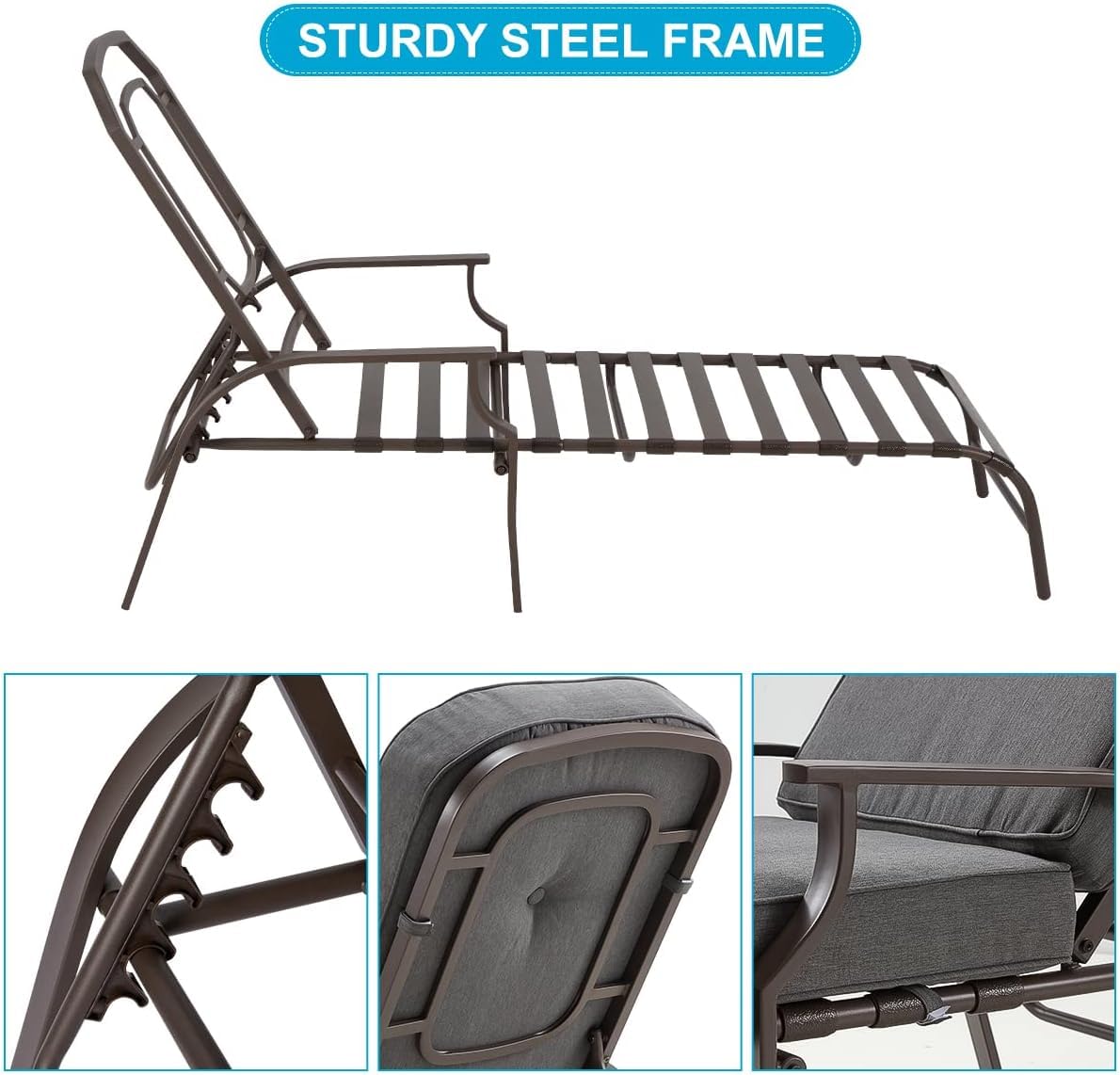 - 【PADED CUSHION WITH VELCRO TO FIX】Patio lounge chair come with 4” thick UV, water resistant and polyester cushion, offer you a super comfort even for a prolonged period of time in a reclined position. Cushions can be fixed on lounge chairs with velcro, so you don't need worry the slip problems. The cushion covers are removable and washable.