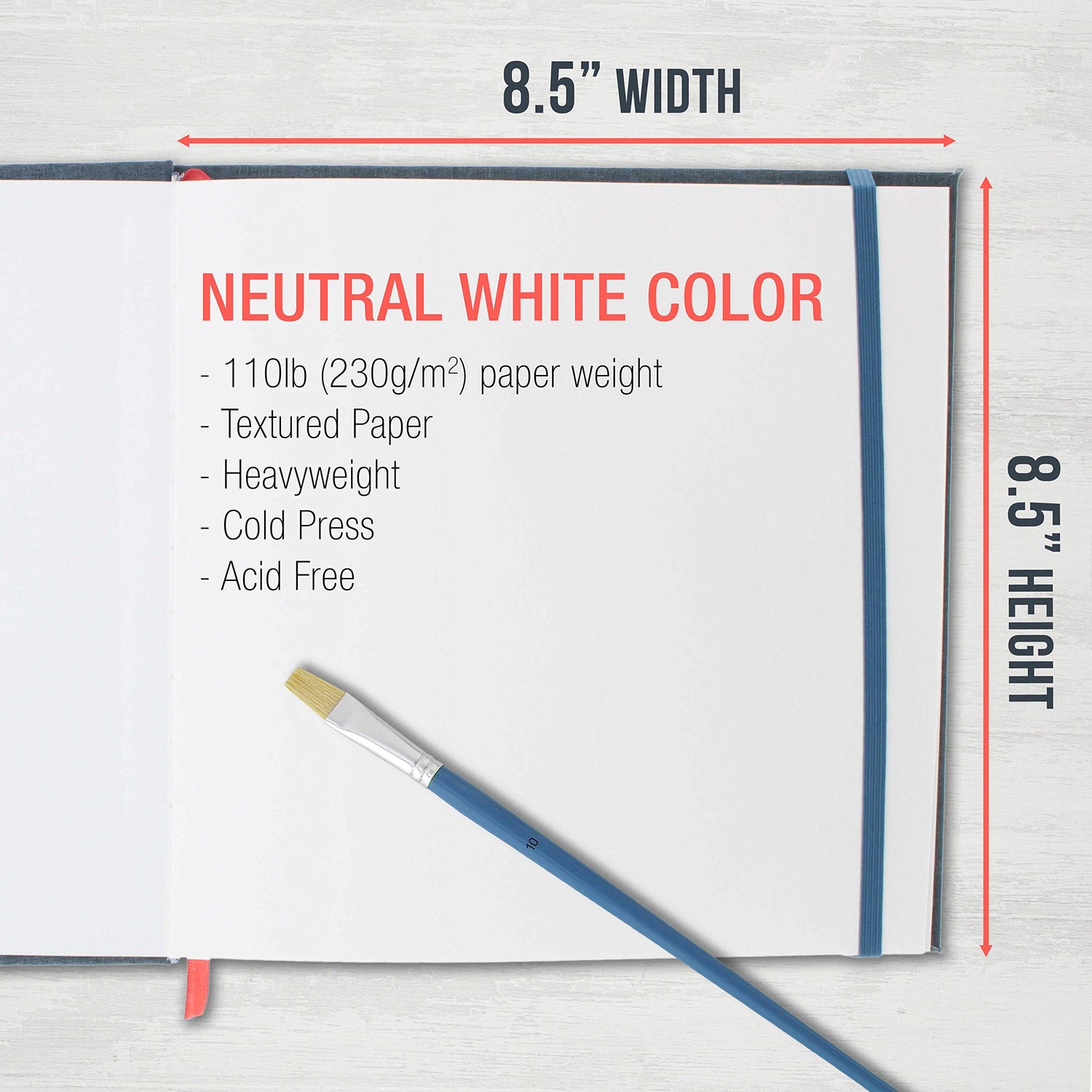 - Pack of 2 premium 8.5" x 8.5" square natural linen-bound hardcover watercolor books, each with 76 pages. Books contain thick heavyweight 110 pound (230 gsm) art sketchbook natural white paper sheets that are acid-free with a cold-press textured surface.