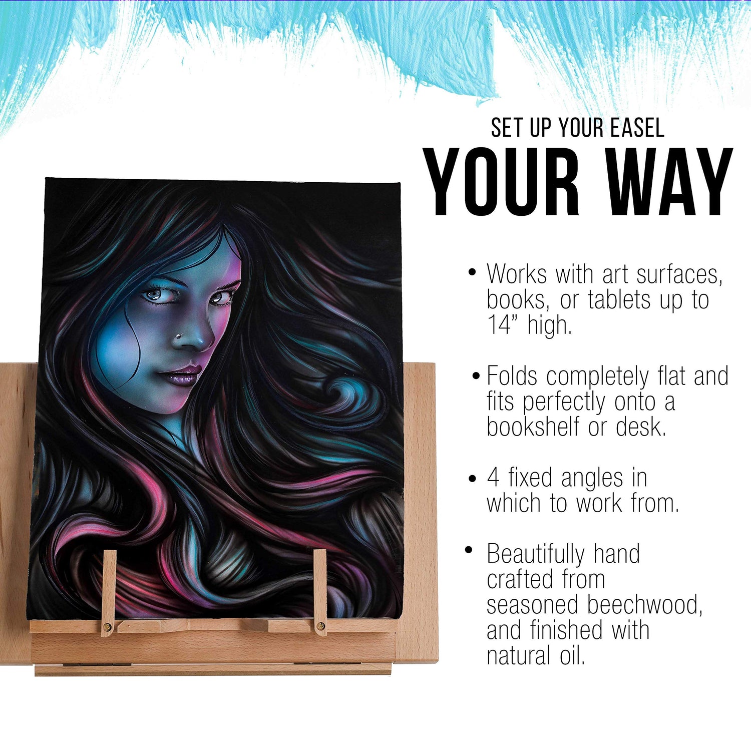 - Adjustable 75° Incline Tabletop Stand: Sturdy, lightweight design for desktop or kitchen counter. 13.5" wide face holds art and books up to 14". Features solid metal hinges.