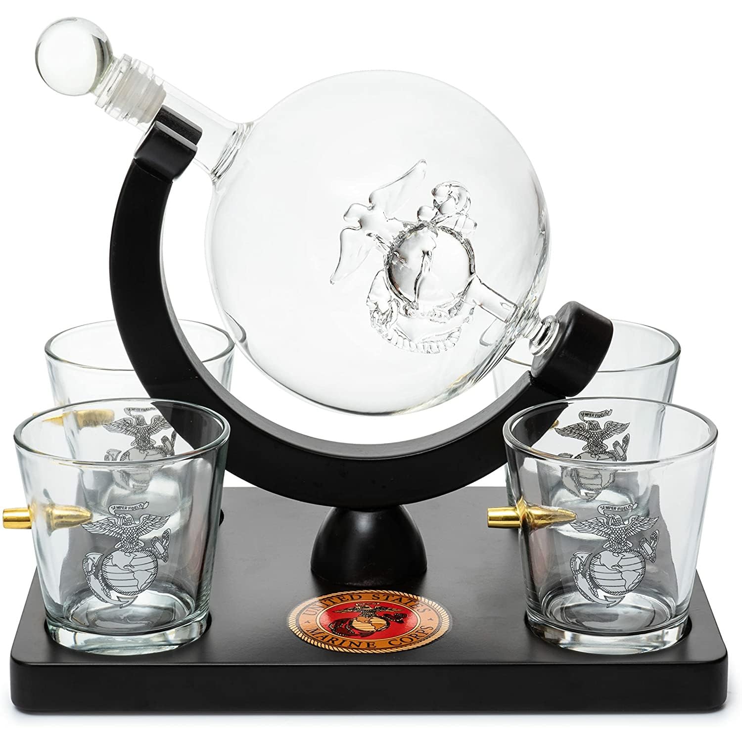 U.S. Marine Globe Whiskey Decanter Set with 4 Liquor Glasses - Marine Veteran Gift Set with Mahogany Wood Base & Emblem - Gifts for Men, U.S.A Flag - Bourbon and Scotch Military Gifts for Dad (29 OZ)