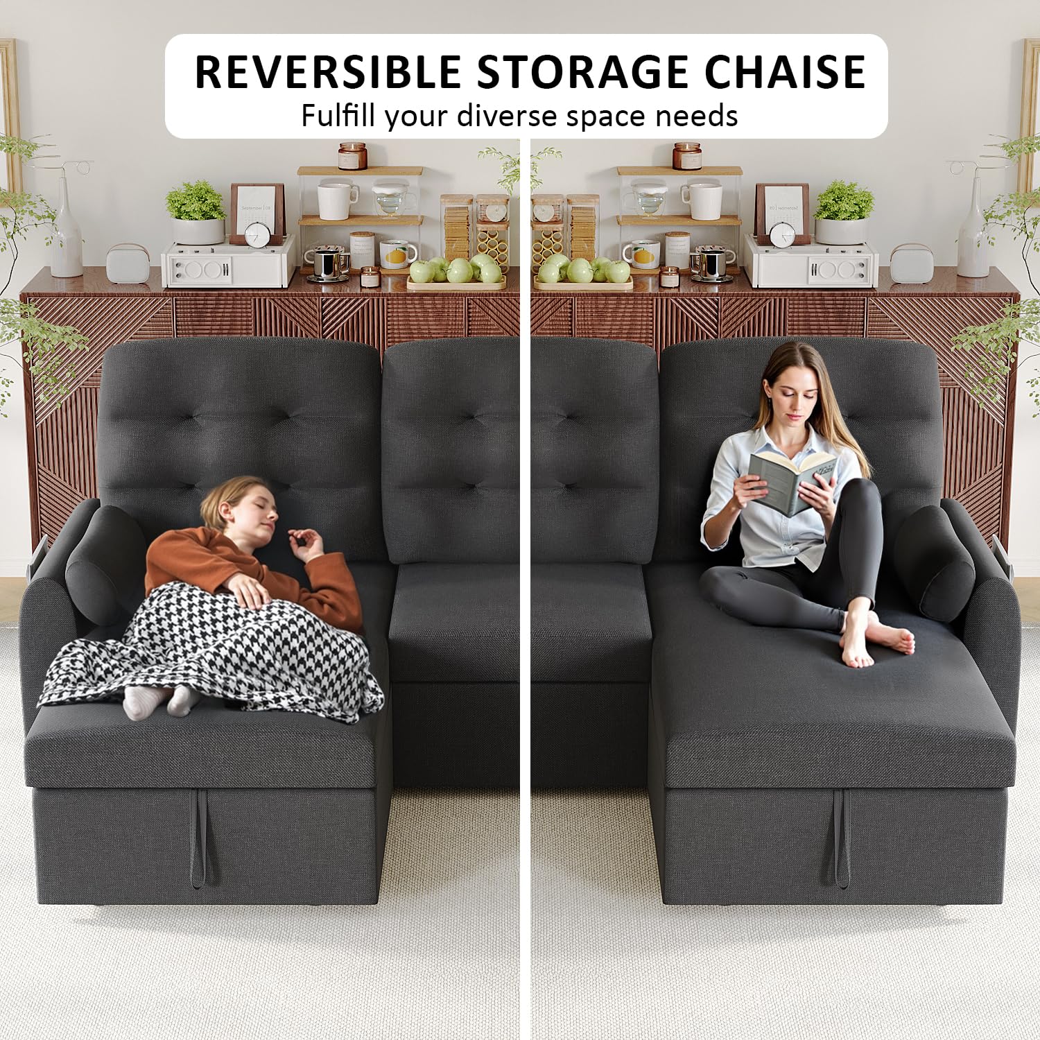 Ucloveria Sleeper Sofa Bed, 86" Convertible Sectional Sofa Couches for Living Room, Pull Out Couch Bed with Reversible Storage Chaise | USB Ports | Side Pockets | Removable Backrest