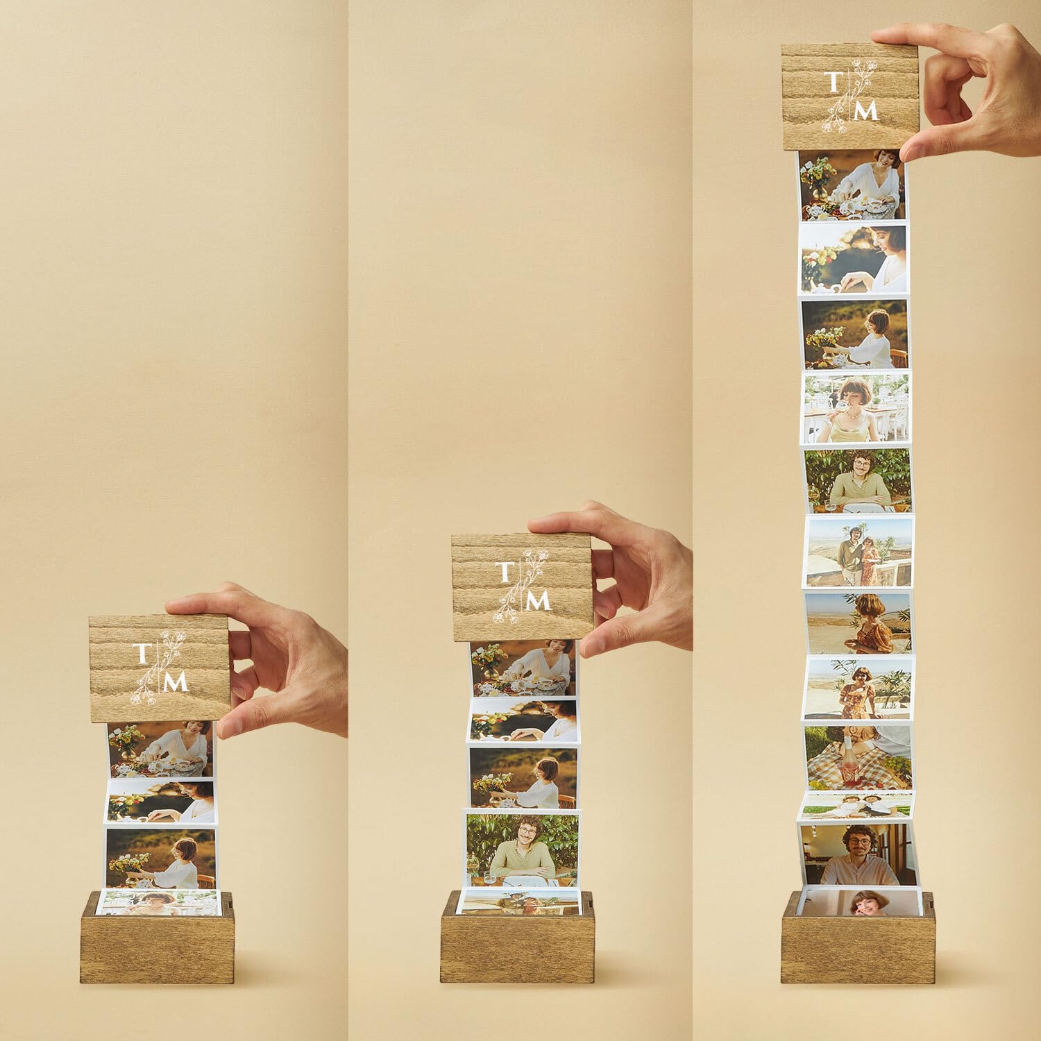 - ELEGANTLY CRAFTED DESING: This wooden pull-out photo box is meticulously designed to hold and display 14 cherished photos in a unique accordion-style layout.