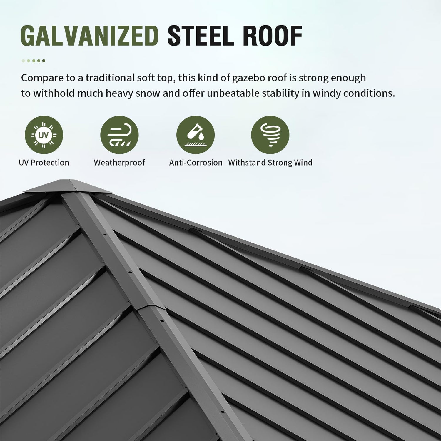 - 🏡【GALVANIZED STEEL ROOF 】Compare to a polycarbonate material, galvanized steel roof that offers great ventilation and airflow. Our top-spliced design provides superior protection against corrosion, weathers heavy snow and rain, is certified fireproof, and keeps out bright and prevents 99% UV rays. Our gazebo ensures long-term use which allows it to easily withstand 5.9 inches of snow and stand stably in winds of over 49 miles per hour.