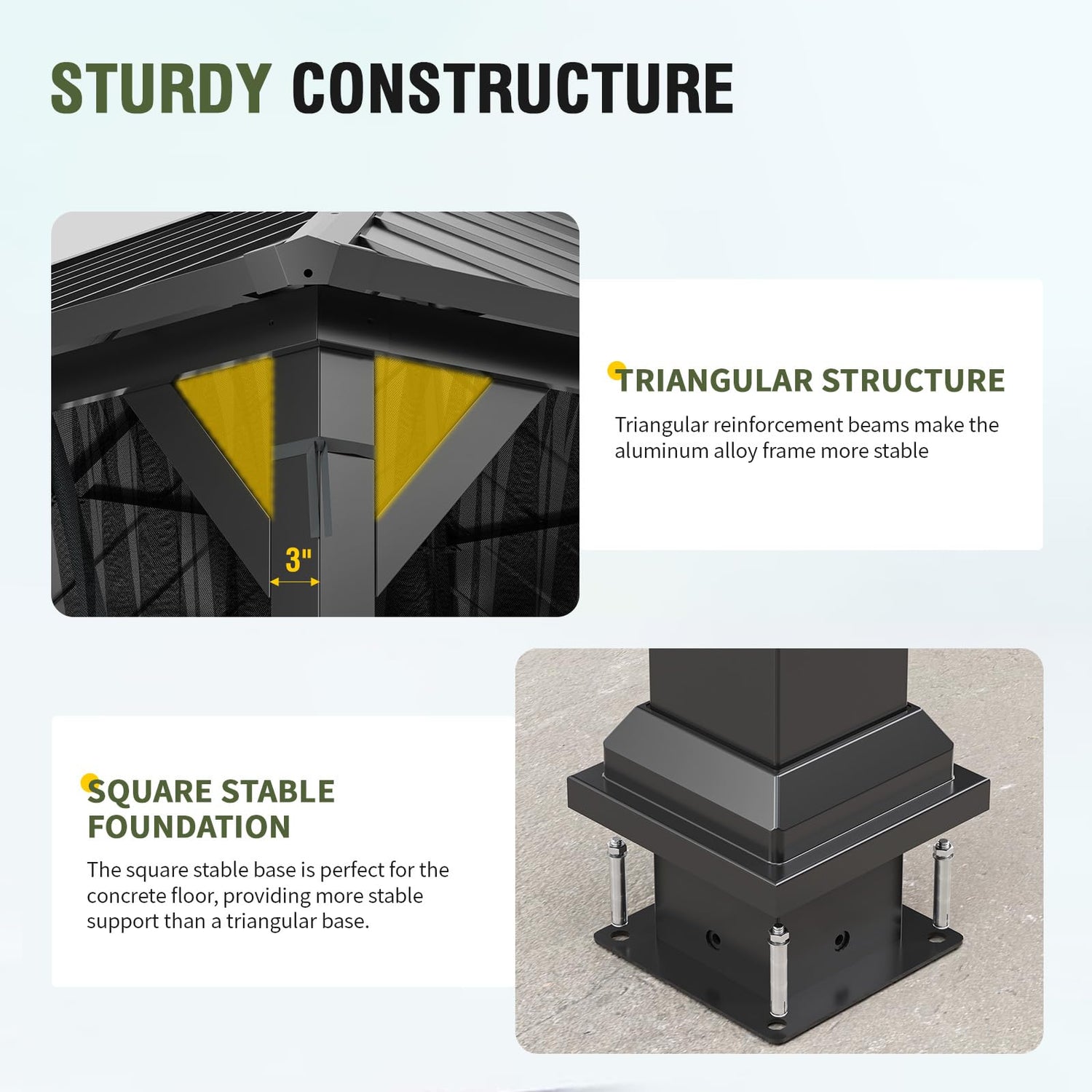 - 🏡【LABOR-SAVING INSTALLATION】UDPATIO hardtop gazebo uses a new splice card slot design that reduces the number of screws and makes the structure stronger. Fewer screws make it look more integrated. Repeated measurements and design will reduce your installation problems.
