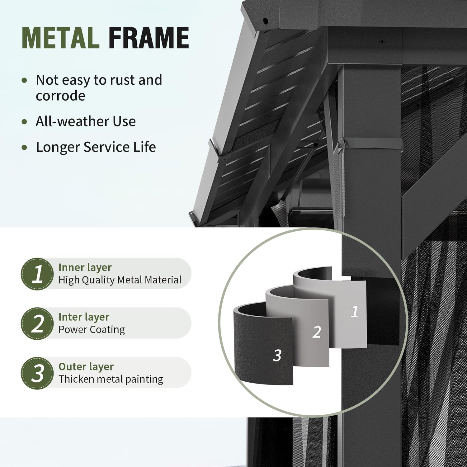 - 🏡【NETTING & HOOK】This patio gazebo has a aluminum track system that allows for sliding each layer with ease. High circulation netting protects you from insects, sun, and rain while still having full airflow and visibility. With "J" hooks on the top roof, you could hang up the lights and fans to enrich the gazebo.