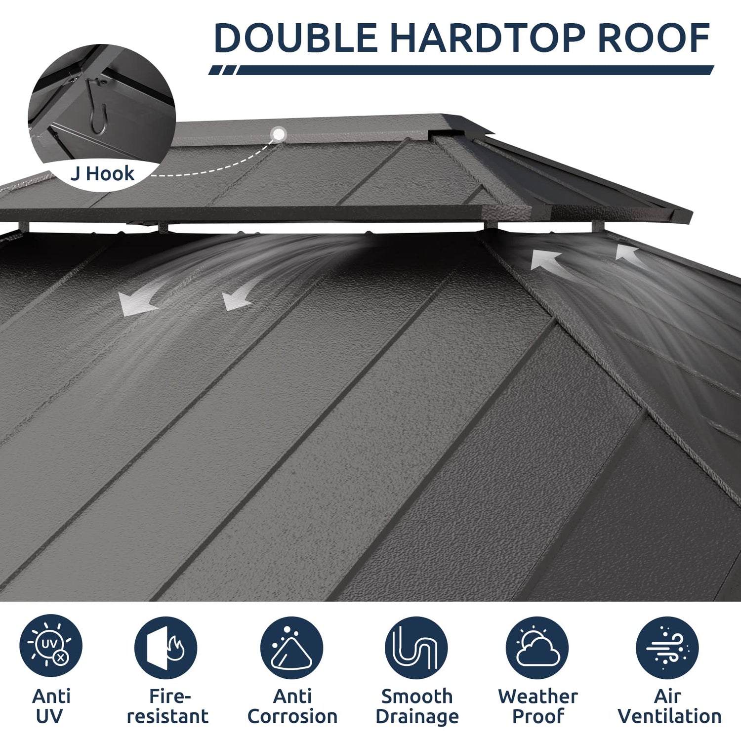 - 【DOUBLE GALVANIZED STEEL ROOF】The double-roofed ventilated roof of the gazebo ensures air circulation while greatly improving stability in high wind conditions. Our galvanized steel roof top-spliced design provides superior protection against corrosion, weathers heavy snow and rain, is certified fireproof, and keeps out bright and prevents 99% UV rays. And there's no need to worry about water leakage between the two tops.