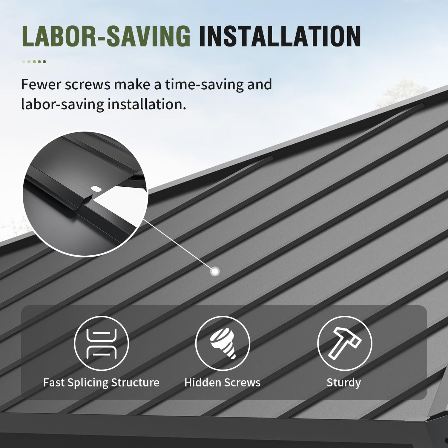 - 【LABOR-SAVING INSTALLATION】UDPATIO hardtop gazebo uses a new splice card slot design that reduces the number of screws and makes the structure stronger. Fewer screws make it look more integrated. Repeated measurements and design will reduce your installation problems.