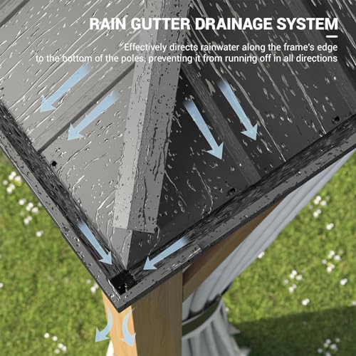 - WATER GUTTER DESIGN: Professional drainage system that guides rainwater from the edge of the frame into the interior of the columns and drains from the ground, preventing damage caused by water accumulation and seepage, and increasing snow load. It keeps the hardtop gazebo in good condition even in rainy and snowy seasons and prolongs the service life.
