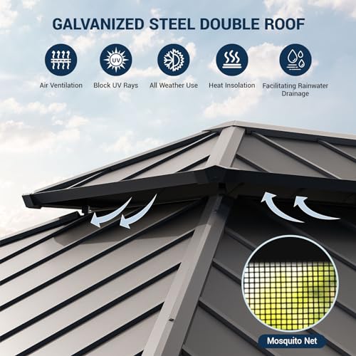 - GALVANIZED STEEL DOUBLE ROOF: Our outdoor gazebos have double-layered galvanized steel roofs that are sturdy and strong enough to withstand high winds and snow, as well as summer heat and harmful UV rays. The double-top design facilitates ventilation, cooling and wind speed reduction.