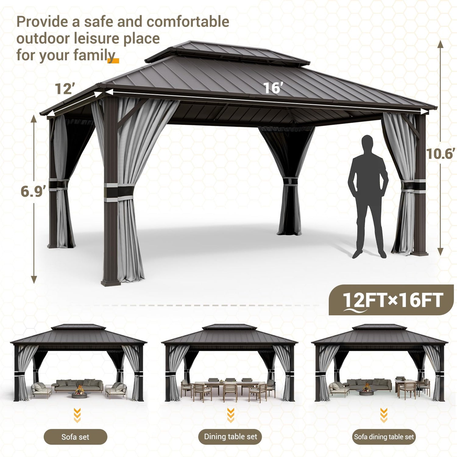 - 【12' x 16' HARDTOP GAZEBO】The fully assembled gazebo measures 16' L X 12' W x 10.3' H and can cover 192 square feet. Extremely large to accommodate 10 to 14 people for your party which provides ample space for a sofa set or a 7-piece dining set. This outdoor gazebo is perfect for an outdoor BBQ, soaking, meeting guests, or daily relaxation. It can also be set up as an outdoor parlor, dining room or even a parking shed.