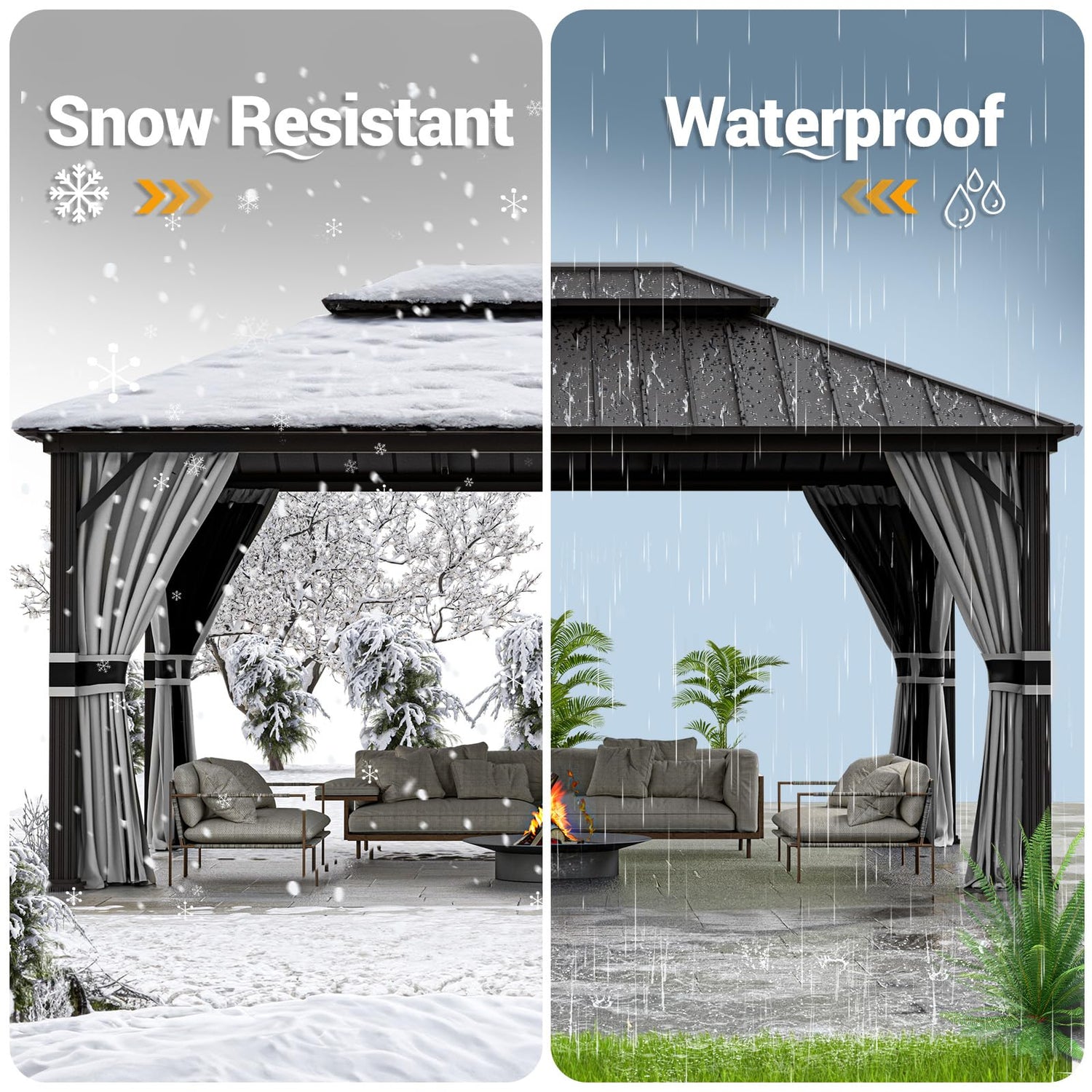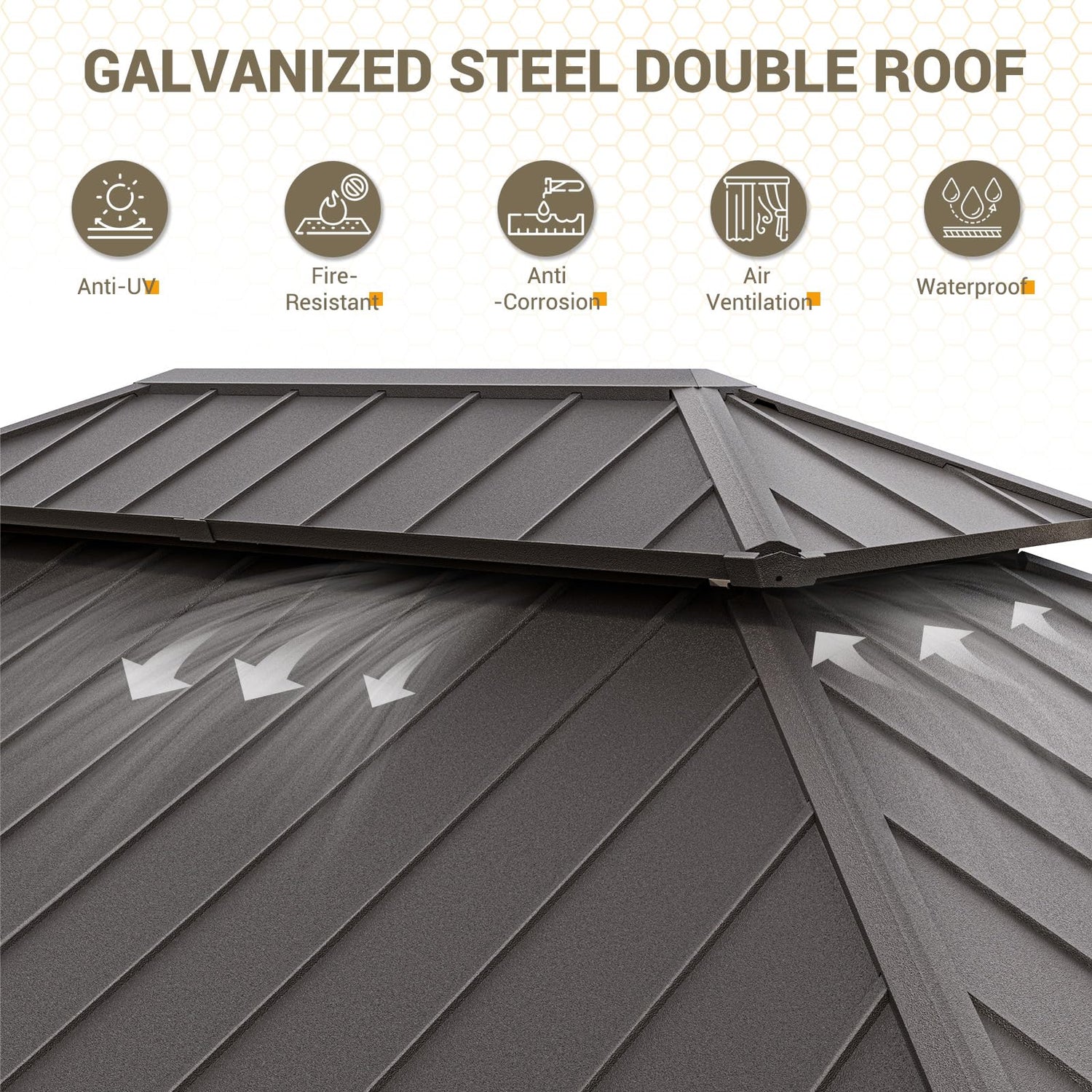 - 【DOUBLE GALVANIZED STEEL ROOF】The double-roofed ventilated roof of the gazebo ensures air circulation while greatly improving stability in high wind conditions. Our galvanized steel roof top-spliced design provides superior protection against corrosion, weathers heavy snow and rain, is certified fireproof, and keeps out bright and prevents 99% UV rays. And there's no need to worry about water leakage between the two tops.