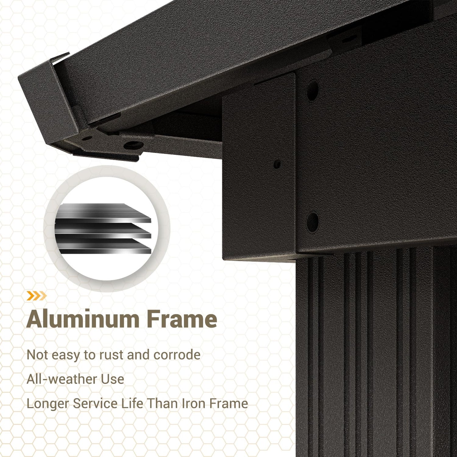 - 【UPGRADED STURDY ALUMINUM FRAME】The gazebo's 4.7"x4.7" aluminum frame uses a square rustproof pillars, which is much larger and more solid than the standard model. Pre-drilled holes and ground stakes also increased stability and durability. Black powder coated design, resistant to fading, makes it more stable, anti-corrosive, waterproof, and resistant to all weather conditions.