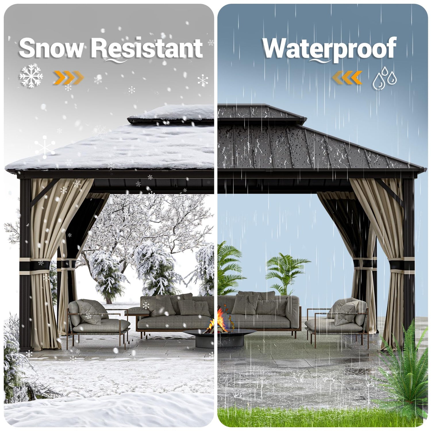 - DOUBLE GALVANIZED STEEL ROOF: The double-roofed ventilated roof of the gazebo ensures air circulation while greatly improving stability in high wind conditions. Our galvanized steel roof top-spliced design provides superior protection against corrosion, weathers heavy snow and rain, is certified fireproof, and keeps out bright and prevents 99% UV rays. And there's no need to worry about water leakage between the two tops