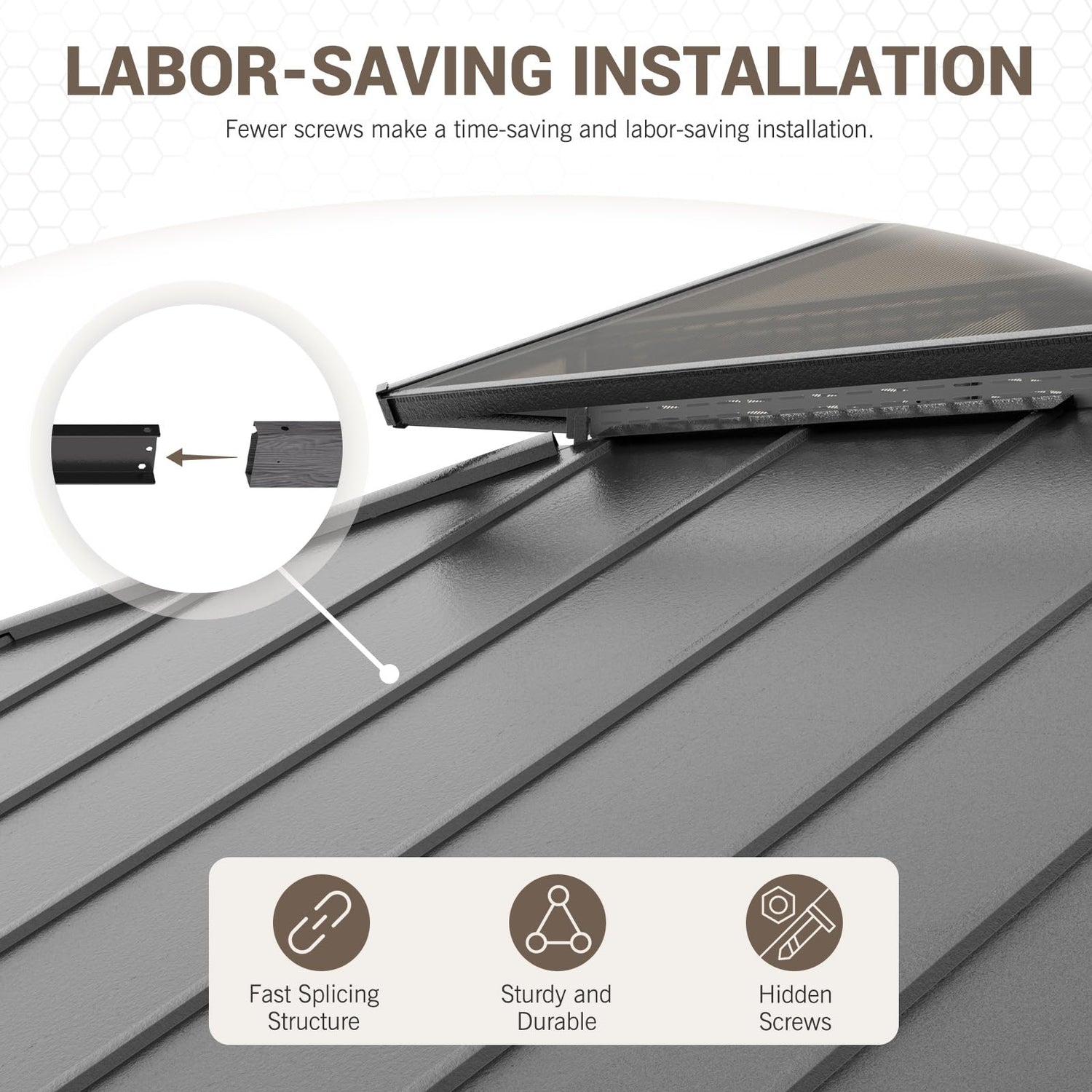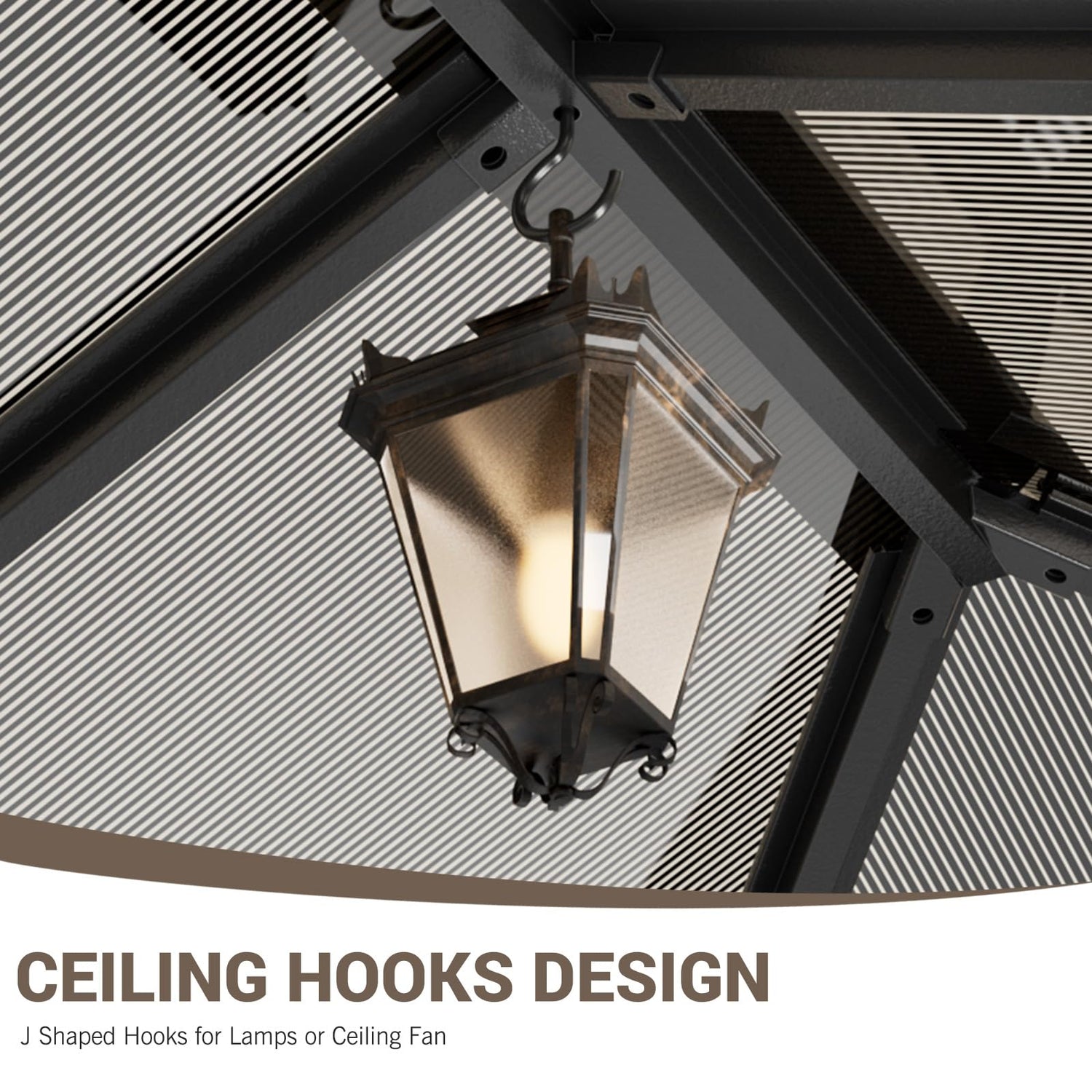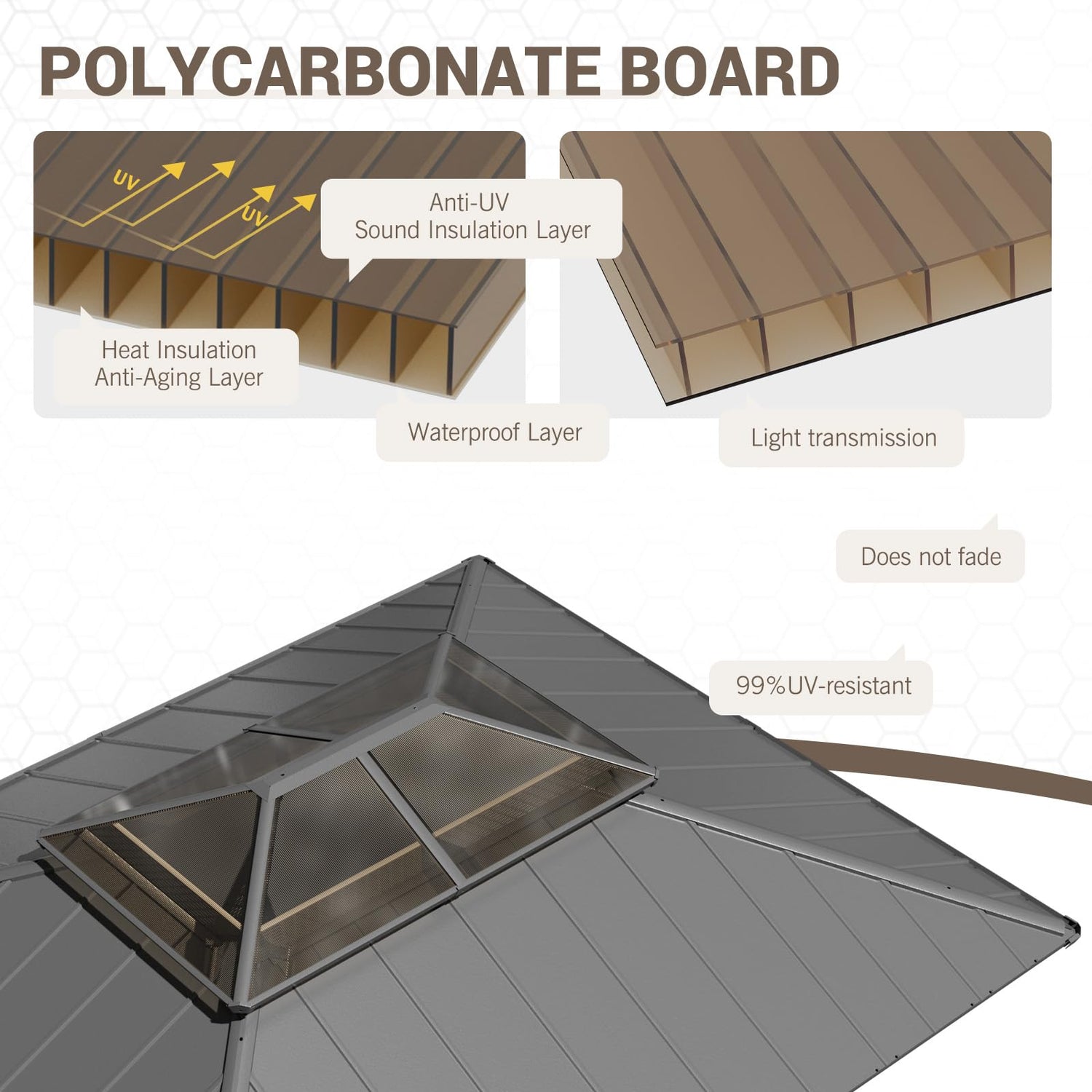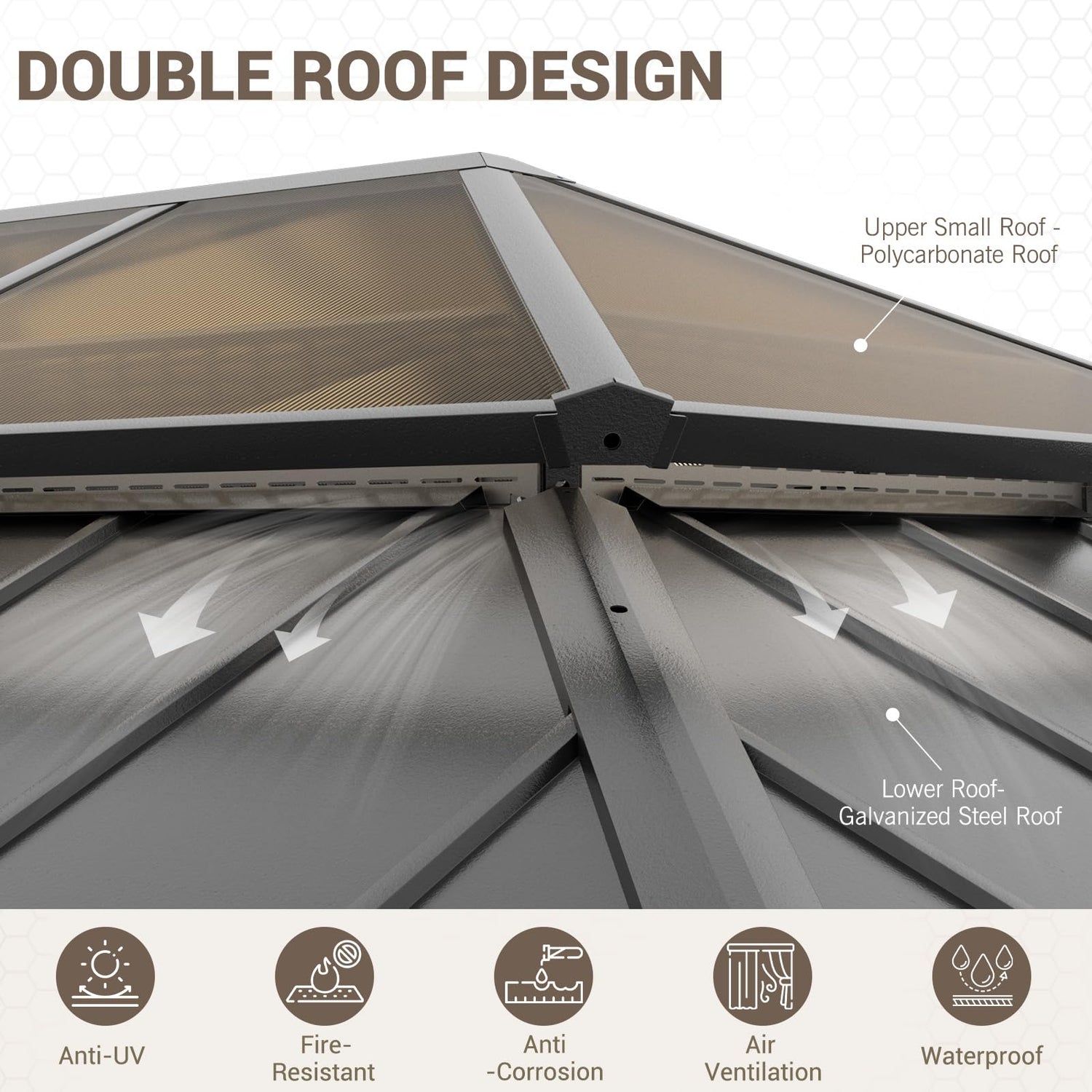 - 【Double Roof Hardtop Gazebo】The gazebo features a polycarbonate upper roof and galvanized steel lower roof. The roof allows natural light to filter through while providing shade and protection from harmful UV rays. It also provides protection from rain and snow for year-round relaxation.