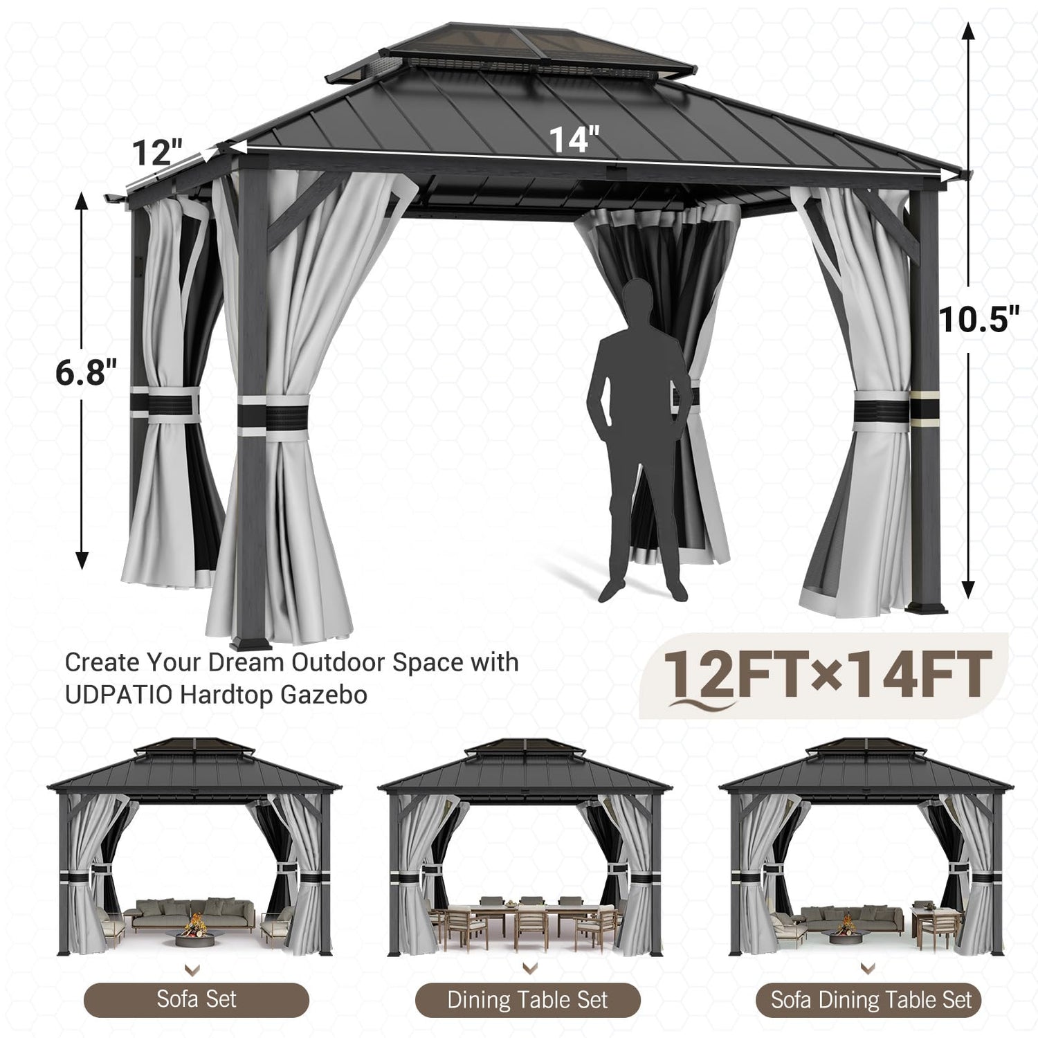 UDPATIO 12'x14'Hardtop Gazebo, Heavy Duty Aluminum Patio Gazebo with Double Galvanized Steel and Polycarbonate Roof,Curtains and Netting Included, Large Outdoor Gazebo for Patio, Deck, Backyard, Grey